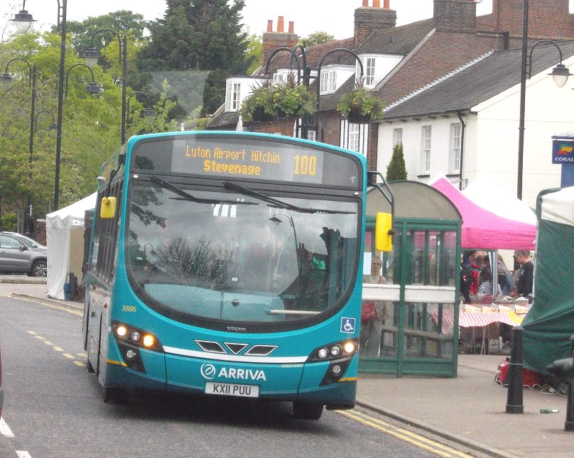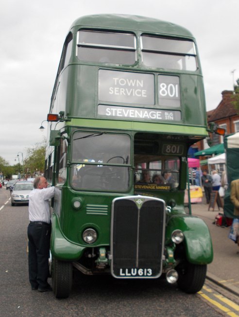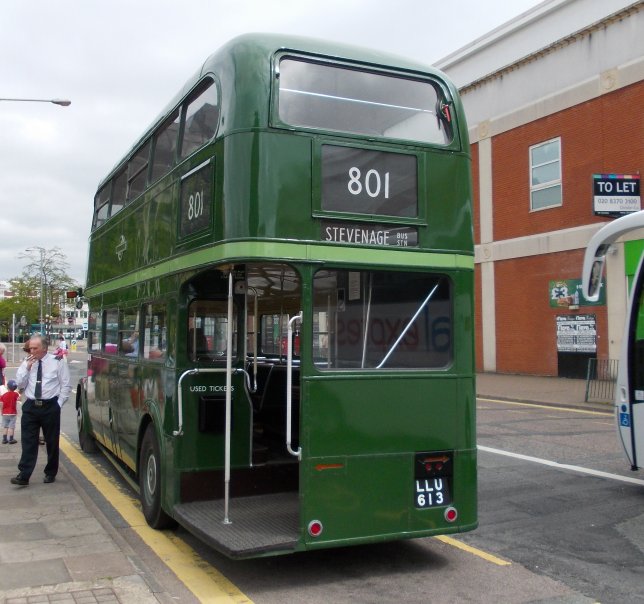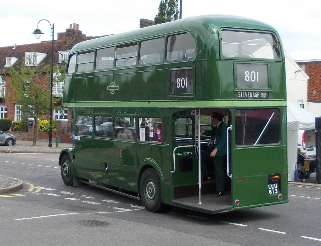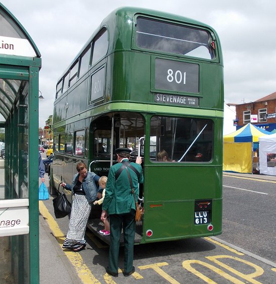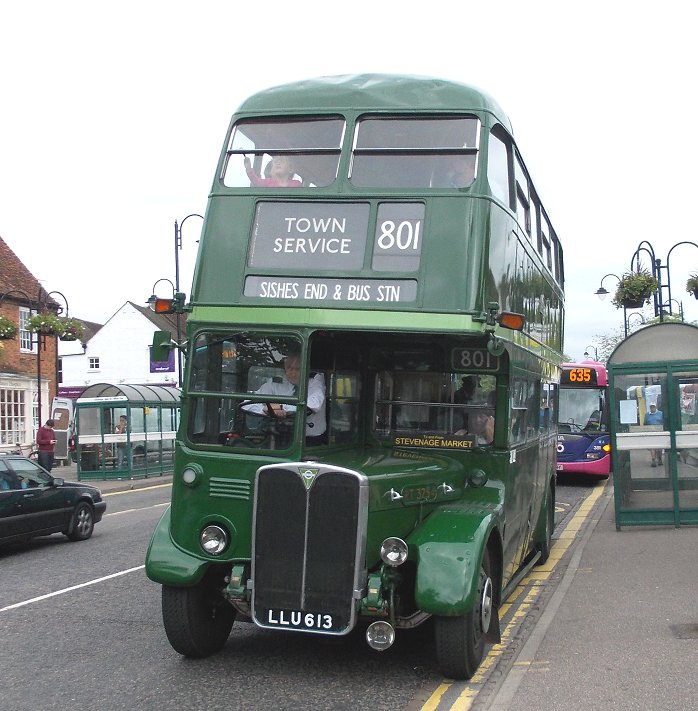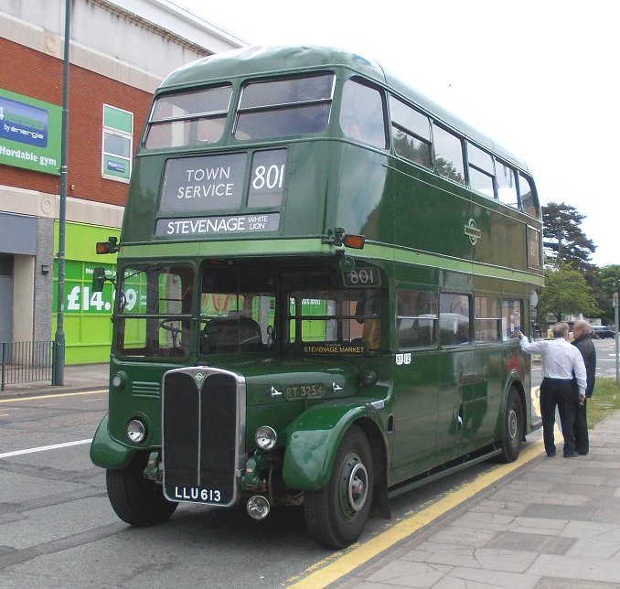 Stevenage Running DaysSaturday 8th, Sunday 9th June 2013Prepared by Ian Smith, 10th June 2013.Saturday morning in StevenageStevenage: the normal bus stationHaving spent the night in Cambridge with some of my family, I arrived much earlier than normal at Stevenage on the Saturday morning. I had heard that RT3254 was to be operating the farmers market shuttle between the bus station and Stevenage Old Town, so walked over the bridge from the station to Stevenage bus station. No RT in evidence, but a normal complement of Saturday morning buses. Volvo/Wright 3884 was resting from a route 100 service, Dart SLF 3808 was off the SB2, and Volvo/Alexander 3459 was off the SB4.VDL / Wright Pulsar 3751, moved here from Arriva Kent Thameside, was squeezed in next to the tree between turns on SB8. Another of the ex-Sovereign Dart SLFs - 3807 - swept round to the stands to start a turn on the SB3. Yet another of the Superbus routes, the SB1, had VDL/Wright 3412. Centrebus Solo 223 was there as a reminder that this is not just an Arriva zone. It was off the 384: the rambling country route still connects Hertford and Stevenage via Ware, Dane End, Benington and Walkern, five times a day. I walked north from the Bus Station towards the Old Town, and soon found progress blocked by a supermarket. I worked my way round, and crossed under Fairlands Way to the King George V Playing Field. I angled across to reached the High Street, and headed into the Old Town. A familiar sound ahead caused me to look up, to see RT3254 turn down the ramp from Trinity Road onto the High Street ahead of me. Stevenage Old TownI passed under Trinity Road, and continued up the High Street towards the bus stops at The White Lion. 2002-vintage Volvo /Wright Renown 3311 came the other way on a 55, followed by 2009-built VDL / Wrightbus Pulsar 3408 on local SB1.801: Stevenage Old Town and Stevenage Bus Station, RT3254Up at the "White Lion" I met Chris Wills and Peter Larkham with Green Line RT3254. They were working a series of 801 shuttles between Stevenage Bus Station and Stevenage "White Lion" on behalf of Stevenage Farmers Market, held monthly in the Old Town (Not that RT3254 appears every month). I climbed aboard just as Peter was about to ring off, and claimed a seat at the nearside front, downstairs.We went down the busy High Street, where cars parking end-on to the street, cars leaving parking spaces, and cars waiting for soon-to-be-vacated spaces kept the traffic to a crawl. Approaching Trinity Road we had to turn left to reach a little roundabout onto Trinity Road, so that we could cross over the High Street subway to reach the big roundabout on the inner by-pass - Lytton Way. We rocketed south down the main road, rounding another roundabout at the end of Fairlands Way, and using the bus-only lane past the end of Swingate. Beyond the modern station stop we turned left at the roundabout to turn into Danestrete, leading up to stop K, where the bus garage used to be. Another of the ex-Sovereign Wright Renowns, 3303, left the bus station on SB2. Stevenage is one of the few towns around London to retain an express Green Line service to London - the 797 - despite having excellent rail connections too. One of the DAF / Van Hools, 4065, came to call at the bus station while we were there. These coaches can accommodate a pre-booked wheelchaired passenger, having a long front overhang and a second front door. Arriva The Shires at Stevenage now has a preponderance of buses with Wright bodywork. That does not mean a standardised fleet by any means, as the chassis under them come from a variety of builders: DAF, VDL, Volvo and Scania. Representing the last, 3610 came out from the bus station with Wright Solar bodywork on its Scania L94UB chassis. Mini-Pointer Dart 3493 shows that Arriva is trying to promote its local services with a stronger SuperBus branding on its fresher more-blue livery, having had a period when it could not decide whether to go for the interurban blues or the older insipid turquoise and cream for its new buses on local services. Centrebus Solo 353, arriving on the 383 shows the impact that a really good livery, well-maintained, can have. RT3254 was set up for its short return journey to the Old Town. We perforce circulated through the bus station, then roared back pat the railway station on Lytton Way before turning in to Victoria Road and the OLd Town. As we approached the stop at the White Horse Arriva 3886 pulled away in the opposite direction on a route 100 service to the Bus Station. Not far behind was Enviro300 Dart 3557 on the long 301 route from the Lister Hospital via Stevenage, Welwyn, Hatfied and St.Albans to Hemel Hempstead. RT3254 emptied out opposite the farmers' market, and went round the extended roundabout at the north end of the High Street to pull up at the southbound stop, ready for its next trip to the bus station. I stayed with the RT for another round trip to the bus station and back. This time I travelled upstairs at the front. The high vantage point gave me an excellent view of Stevenage Bus Station as we pulled in. DAF 4065 was just leaving, heading back for London on the 797. Something different in the bus station was ex-Go Ahead North East Dart SLF X508WRG, now with Landmark Bus. This, now in white but retaining its lime green doors, was working the 391 via Weston and Letchworth. Centrebus Solo 353 was resting in the bus station too, as were Arriva's Dart SLF 3810 and VDL/Wright 3407. We headed back to the Old Town, where I stayed put as we circulated round the extended roundabout at the top of the High Street. A succession of Arriva buses headed north as we re-entered the High Street: an unidentified SLF, 3311 heading north again on the 55, and Volvo/Wright 3887 on the 102 to Luton. I stayed upstairs for the next foray south, beside a family including an enthusiastic young lady who wanted to practise her ballet steps in her Doc Martins. I gently pointed out that it was not kind to dance on
