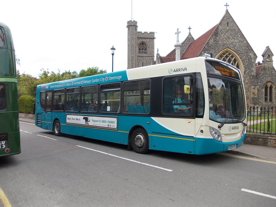 From St.Mary's Square we went round the corner down into the town, and made the circuit through part of the High Street and up Brand Street. Then it was round the south side of the town and back to Stevenage via Lister Hospital and the Old Town. With Stevenage Day in progress on the KGV Playing fields we called at the stop on Fairlands Way. With the traffic conditions we could not turn right at the roundabout after calling at the stop, so had to go east up the rise to the next roundabout before coming back to St.George's Way. We skirted round the east side of the town centre to reach the bus station. 303: Stevenage Bus Station to Stevenage (Trinity Church): RT3254The next leg was even shorter: bus station to the Old Town. On our way out of the Bus Station we met the East Kent Reliance coming in with a 390. It was followed by Arriva's GreenLine 4068 on the 797. As we headed up Lytton Way towards the Old Town we met RF633 again, heading south for Benington after a lunch-time brak at the Old Town.We pulled up at the White Lion, and the bus emptied. Cris and Peter were taking it away to park so that they could have their lunch break. I too went to a pub for Sunday lunch. 303: Stevenage Old Town to Welwyn Garden City: RT3254I was back at the stop in good time for the resumption of afternoon service. Arriva's Enviro300 Dart arrived first, on the 301 to Hemel Hempstead. It was shortly followed by RT3254, on the 303 to Welwyn Garden City, covering much the same route south to Welwyn as the Dart.I took the seat behind Chris Wills, with a good view over his shoulder of the road ahead. We set off through the Old Town, then running down Lytton Way to turn in to stop in Fairlands Way. This time traffic conditions were favorable, and Chris could pull across four lanes to turn right at the roundabout, to run down St.George's Way to reach the roundabout at the south end of the Bus Station. GS2 was waiting in the bus station. WE headed south from Stevenage, negotiating the tangle of roundabouts to emerge on the road to Knebworth. We passed over the Hertford loop railway, and followed the old Great North Road south through rolling countryside to reach cluttered Knebworth. We carefully negotiated its crossroads, and continued south, passing the junctions left for the 329A to Datchworth (via Swangley's Lane) and the 329 at Woolmer Green. We climbed over Mardley Hill, terminus for the 388, and descended towards Welwyn. We passed under the modern A1(M), and turned up Church Street, before turning left down to reach Welwyn Church. We paused for photos, but this was cut short by the arrival of a northbound 301, in the shape of Arriva Enviro300 Dart 3554, thus blocking the road. We set off as soon as we could get people back aboard, heading through Welwyn Village along the old winding road, passing Prospect Place, the erstwhile terminus for the 388 from Hertford. We headed for Digswell, passing under the A1(M) again. As we approached Digswell we saw a GS round the corner ahead of us - a 388 from Hertford to Welwyn Garden City. We followed it south, briefly, then turned up into Knightsfield. This was a big dipper of a route, with the bus crawling up to the heights, then rushing down through a hollow and up the other side. We turned down into Welwyn Garden City, and made our way to the Station. GS17 was still sitting there with the connection to Hertford. There was only a small interchange of passengers though, most of the GS passengers wishing to return directly.