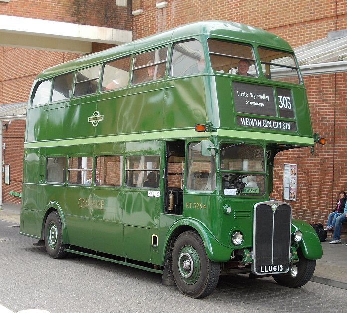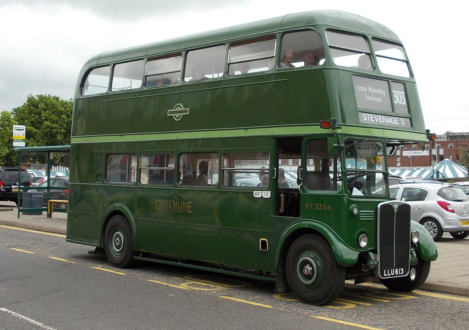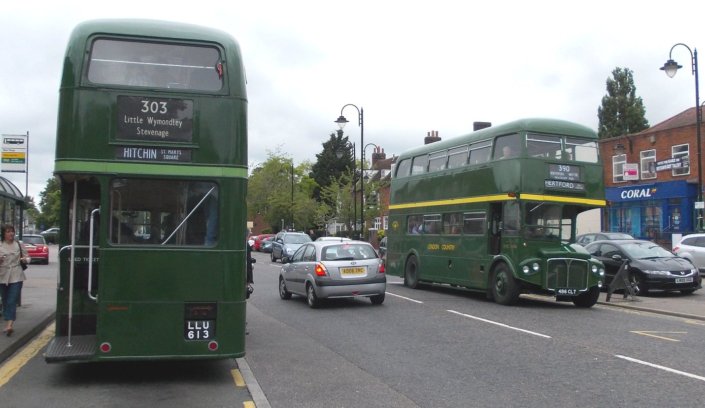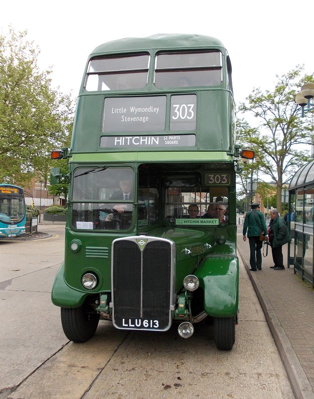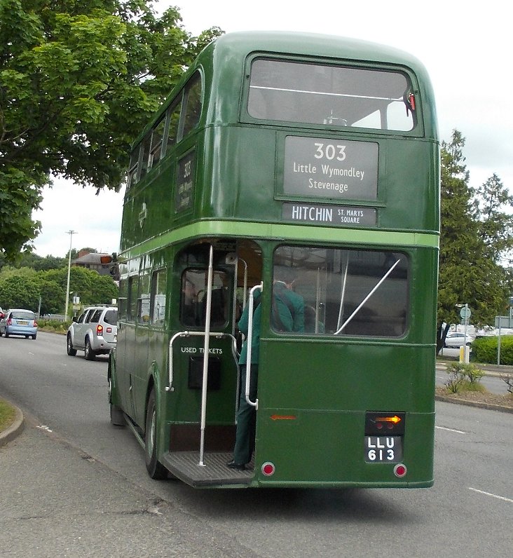Stevenage Running DaysSaturday 8th, Sunday 9th June 2013Prepared by Ian Smith, 21st June 2013.Sunday afternoon with RT3254303: Stevenage (White Lion) to Hitchin: RT3254RT3254 arrived back from Welwyn Garden City on a 303 to Hitchin while RMC1500 was turning round the block to head back south on the 390. So for a glorious minute or two both green double-deckers stood on opposite sides of the road in Stevenage Old Town. That hasn't happened for a long time.I decided that I was not fulfilling any useful function by remaining longer in Stevenage. I had despatched waiting passengers, mostly south on the RMC, with some sent to the bus station on the preceding GS in order to secure seats on the likely-to-be-popular circular trip via Weston and Hitchin. So I joined the RT, taking a seat behind the bonnet for the short trip to Hitchin. We headed north, round the big roundabout then north-west along Hitchin Road to Lister Hospital, where we pulled in to visit the bus stop. Then it was on again, under the A1(M) and out along the Little Wymondeley by-pass. (The ECML main line railway bridge in Little Wymondeley is only plated for 14ft 3in these days). The dual carraiageway gave way to normal main road as we wound over the hilly terrain to Hitchin. At the big roundabout south of Hitchin we turned down the cutting to reach St Mary's Square. We reached St.Mary's Square, where we pulled up at the stops to change the blinds for the short-working return to Stevenage. 303: Hitchin to Stevenage Bus Station: RT3254