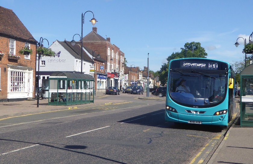 303: Stevenage Bus Station to Welwyn Garden City Stn and return (RT3148)Stevenage Bus Station was quiet. A brace of Arriva E300s, in interurban blue/blue, stood in the central stance awaiting their turn. We wound up the blinds for a trip south to Welwyn Garden City.We headed south, back past Roaring Meg and the Tesco store, onto the Knebworth Road. The sun shone as we climbed over the ridge to Knebworth, and up towards Woolmer Green. We climbed over the wooded Mardley Hill, and drifted down towards Welwyn. We passed under the A1(M) and climbed Church Hill, turning left to roll down to Welwyn Church, where we paused. We continued, wiggling through the old village of Welwyn, and left into Prospect Place, and on to the roundabout under the A1(M). We headed for Digswell, and turned right at the roundabout and then right again to climb up Digswell Road under the trees, again by-passing the Knightsfield big dipper.