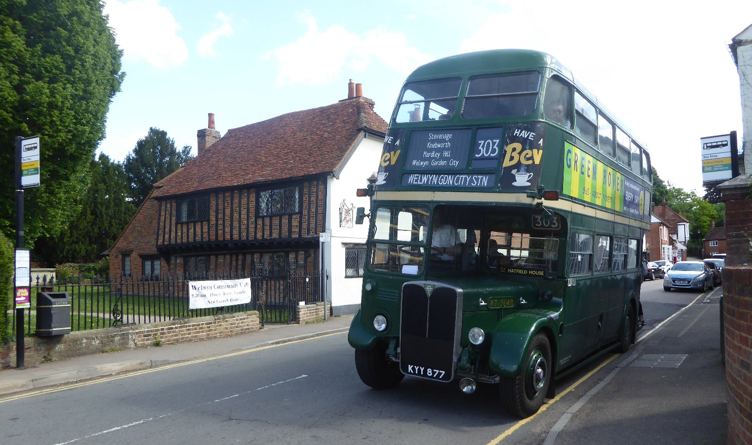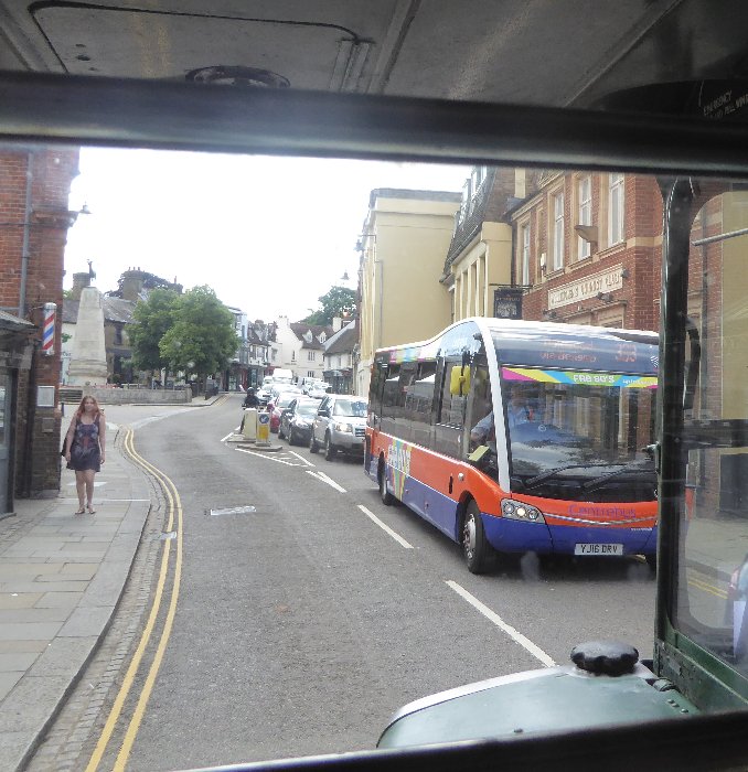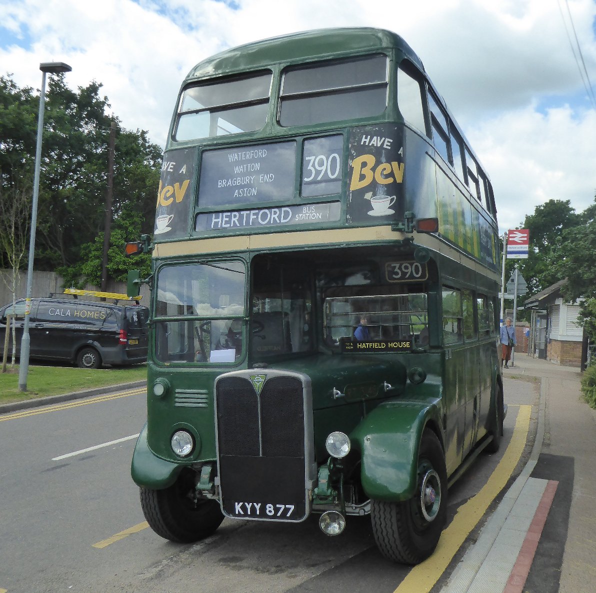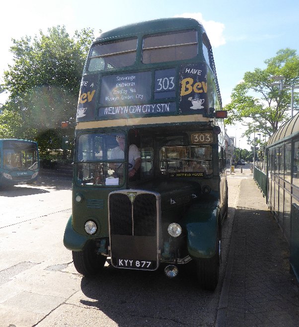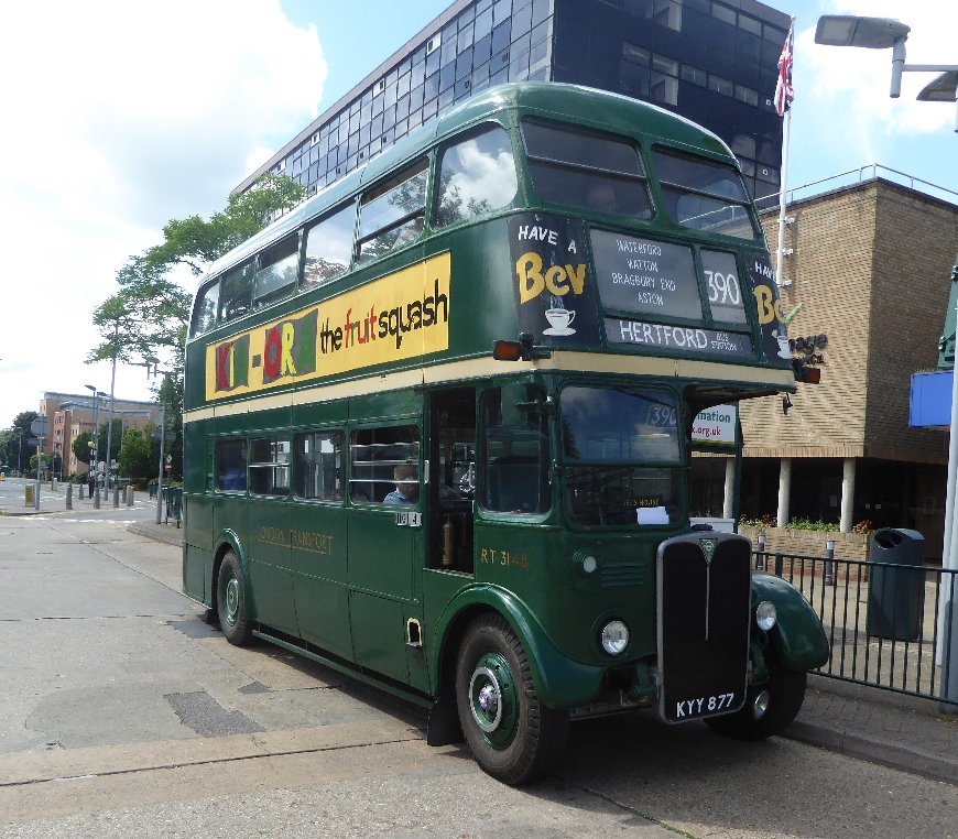 Hertford & Stevenage Running DaySunday 4th June 2017Prepared by Ian Smith, 24th June 2017.On Sunday morning I made my way back to Stevenage by train from Kings Cross. Outside the station I waited at the bus stop for a service bus up to the Old Town. It came in the form of Enviro300 3555, now of Arriva South Counties, on Stevenage local route SB9. That whisked me quickly to the White Lion. Unsure which way the RT would arrive, I crossed to the southbound stop, where Enviro200 3792 soon came past on a 100 to the Bus Station. I did not spot the RT coming the other way, until suddenly it was there, pulling up at the west-side stop. I crossed over to join it. 303: Stevenage (White Lion) to Stevenage Bus Station (RT3148)I was back on RT3148 as navigator today. I would not see as much as if I wandered around from bus to bus at Hertford, but I LIKE RT3148 . The bus is excellent, going well. Its bodywork needs overhaul, showing signs of age in places, with replaced screws and fading paint - although the top and roof have been replaced/repainted, as can be seen in the pictures: green paint darkens and blues over time. The crew works well too: John Huxford is an excellent driver, and Les enjoys conducting. I joined the bus at the White Lion, and we set off, north to the big roundabout, then back through the old High Street, down to Trinity Church. A quick burst down the A602 past the railway station and we were turning in to the bus station.