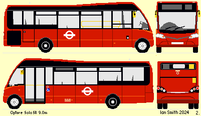 In November 2011 Quality Line took delivery of eight longer (9.7m) Solos for the retendered 470. These were to the revised Solo shape, with the front destination display box wrapped into a rounded front and domed roof. The air conditioning unit still perched on top. They also had two doorways in response to TfL requirements, which meant they were closely linked to their tendered route. The two doors and two wheelchair spaces meant that they only seated one more than their shorther companions. But they did wander onto other routes too. They had been intended to have numbers continuing the OP series, but were instead formed into a class of ther own: OPL01-09.