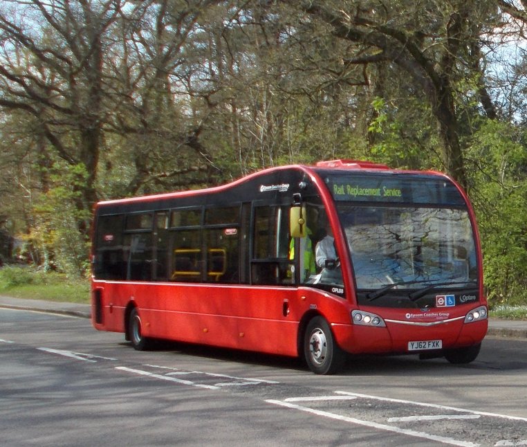During the spring of 2014 Epsom loaned two Optare demonstrators - an 8.9m single doorway SR, followed by an older 8.8m Solo. Both were used on the 408.