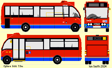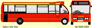 Thorpe's operated a number of niche services for London Buses, including some disability access routes. For these Thorpe acquired a pair of 8.5m Solos with large wheelchair spaces and just 17 seats. These were red with a yellow cantrail band, and were numbered OSL1 and OSL2. They operated out of Perivale West Garage (PA).