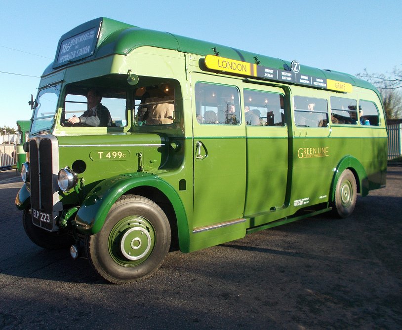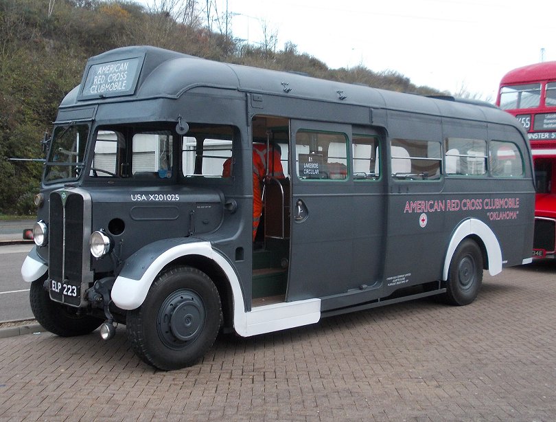 In 1942 many 10T10s were loaned to the US Army and the American Red Cross, who converted them to "Clubmobiles" - mobile canteens. The American Red Cross vehicles were painted grey and given the names of various Ameican cities. They dispensed the kind of culinary comforts indispensible to the American service-man at American bases all round Britain. Others were adopted by the American Army as transports. T499, although not a Clubmobile itself, was painted temporarily as such for an appearance at the 2013 Purfleet Running DayMost, but not all, were returned in 1946. One somehow ended up, reregistered, with Smith's of Reading, and another with Neath & Cardiff Luxury Coaches, with whom it worked for seven years post-war on the Swansea - Cardiff service. Others just disappeared. The others went to Chiswick for overhaul and refurbishment for their return to Green Line duties.Post-war Green Line