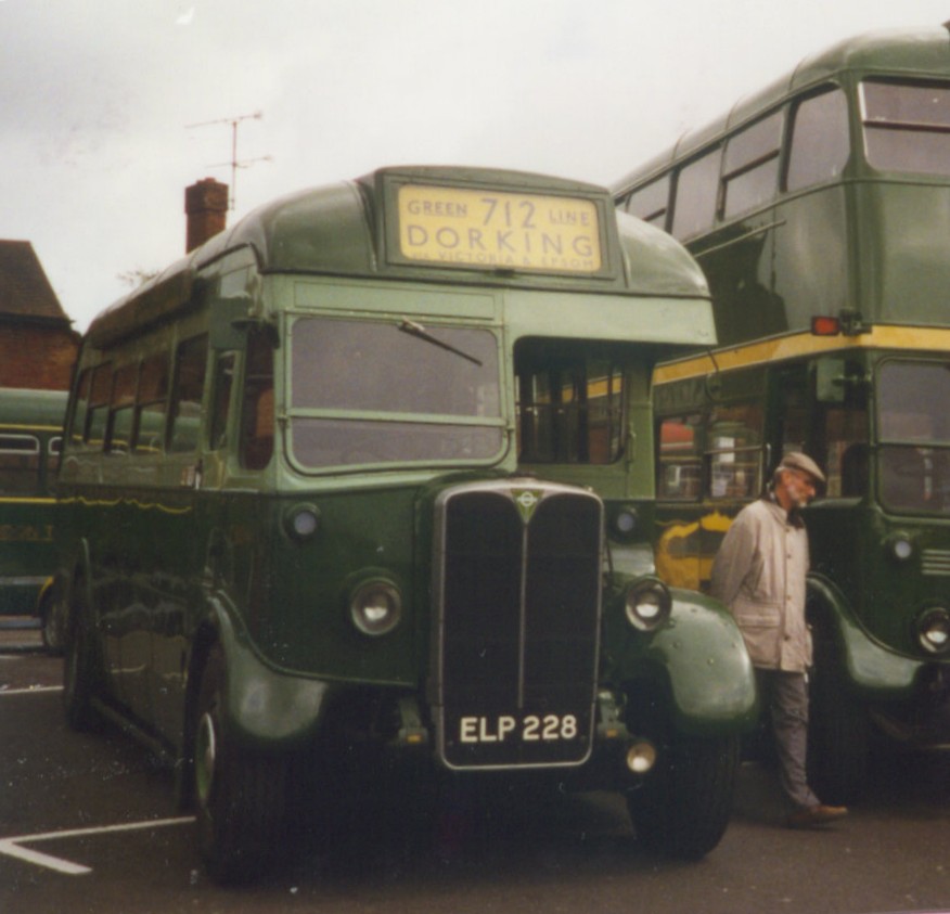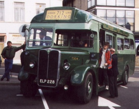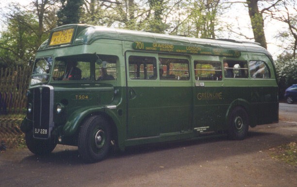 This all led to a redesign around the front, with the nearside wing body-mounted as on the new RT design, and a normal bonnet and cabfront. On the nearside the sliding door was moved outside into a recess, resulting in a little more room inside. The streamlines behind the wheel arches were updated too, and an air-conditioning pod mounted on the rear of the roof. (No, Leyland Nationals were NOT the first). Preserved T504 at Cobham, April 1999Livery at first was the three-tone greens introduced on the 9T9s, which applied to the early deliveries, up to T598 at least. This was followed by two-tone green, with Lincoln green and apple-green. Roof-boards, which had the contemporary raised oval in the middle for the route letter, were black and orange, with white via points on the black, with black for the destinations (and LONDON) if a cross-town route on the orange parts. A black slip-board with white lettering might inhabit the holder by the front saloon window, Blinds appear to have been black, with green GREEN LINE lettering occupying half the display, and the destination in white above or below.