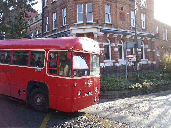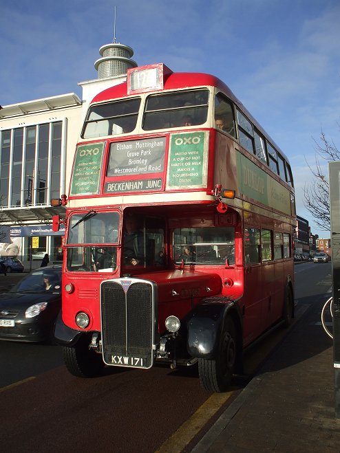 On to Bromley: Southover, Park Lane stops, round Plaistow Green (an innovation since RT days), and on along narrow College Road past St.Mary's and The Farwig. Left at the traffic lights, and empty out at Bromley North Station. Now the announcement task at stops becomes a different one, as from Bromley South we are following the current 162 route to Beckenham Junction, and ordinary passengers need reassurance that we are going their way. We stop at the new (for RTs) Civic Centre stop on Kentish Way, then pass The Glades to regain the High Street. Two stops to Bromley South Station, picking up 162 passengers.
