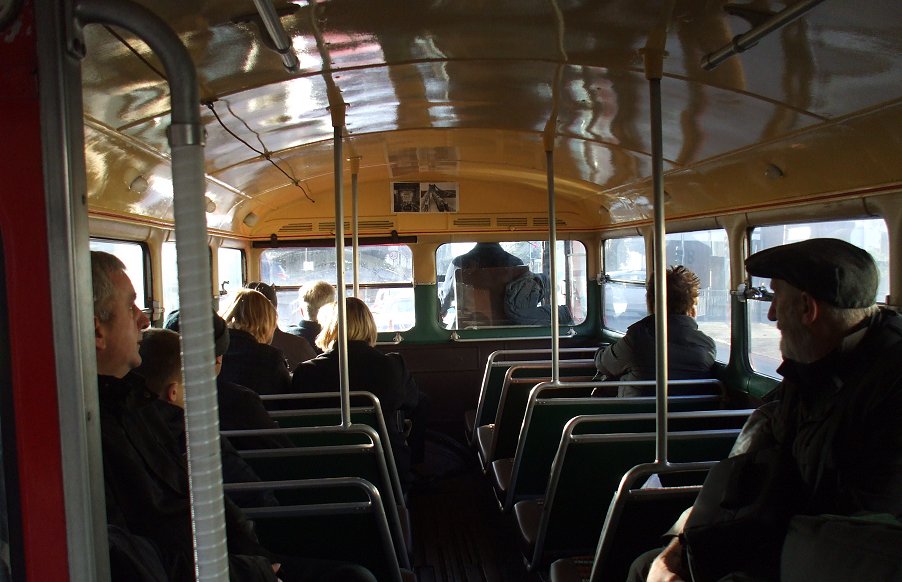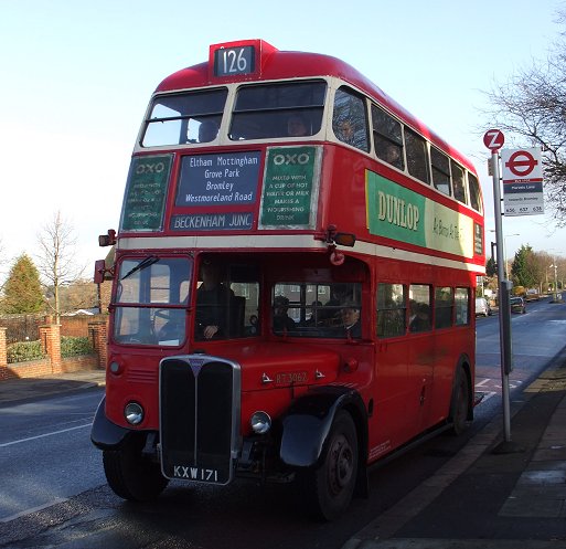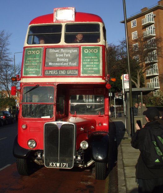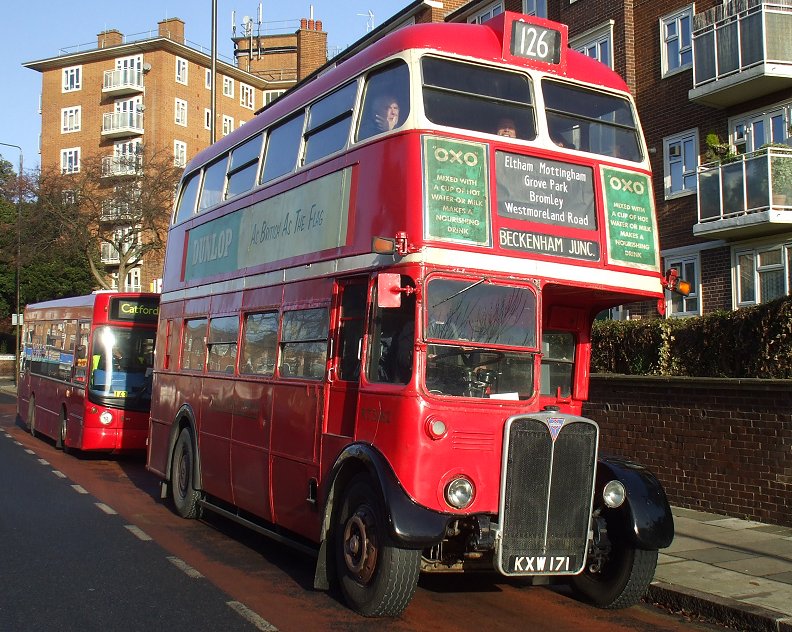 We finally got away about seventeen minutes behind schedule: Colin was driving, John was sitting up front route-learning, and you can guess who was freezing on the platform as conductor. We completed the loop up onto the High Street, and started picking up ordinary 126 passengers. This was not quite as straightforward as it seems, as the modern 126 does a rather different route through Mottingham, so each queue of eager passengers had to be told that it did NOT go via Dunkery Road, that it was a free service and that they travelled at their own risk. This last occasioned a few comments, with people wondering if it was something to do with the age of the vehicle (60 years old, incidentally). We picked up in Eltham and headed for Mottingham. A Metrobus Scania caught up with us at the Mottingham station stop, heading for Chislehurst on the 161.