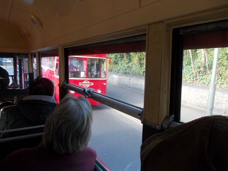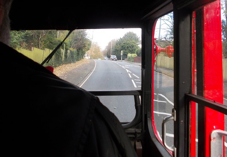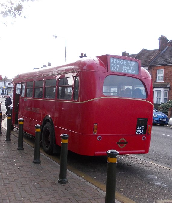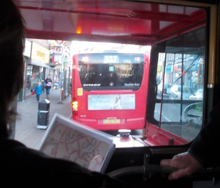 We set off, pausing on the edge of the Common by Chislehurst Ponds to pick up photographers. Then it was up the slight gradient to the War Memorial, where we just didn't make it before the lights changed. A tough start up the grade round the corner. We followed a Stagecoacgh Trident (17789 I think) down the hill and under the railway. Not much clearance for the double-decker under the 14ft 6in bridge. We crawled up the hill on the west side of the village, then motored along the level to Widmore Green, passing RF368 on its way to Chislehurst. I had moved back down the bus to make way for a folded push-chair, which went onto the single seat. So there was no opportunity for further pictures for a while. We picked up a few passengers on the way into Bromley, despite the fact that this is no longer the 227 route, that role now being taken by the 269 and 162. At Bromley there was a changeover of passengers, both at the Town Hall stop and in West Street. The latter was a surprise to me, as I hadn't realised that the north end of the High Street was blocked to northbound traffic, all westbound buses going via West Street and Tweedy Road. We snaked down Swan Hill into Shortlands, and under the 12ft 6in limit bridge, then climbed up out of the Ravensbourne valley. We swooped down towards Beckenham, and stopped to set down at Beckenham Church. Beckenham High Street was a slow crawl of traffic to the War Memorial roundabout. Then we escaped towards Clock House, pausing frequently to set down or pick up local passengers. All seemed delighted, even after the steep entrance steps to the bus. We sidled into Penge through a long traffic jam, passing the stop where I used to alight for school, and worked through to the Crooked Billet, where it was "All change please". I went across the road to exchange greetings with Peter Aves and Alan Charman on RF429, who were having their lunch break. One of the 227 regulars, Mercedes Benz Citaro G number 23108 (TB), came up behind the TD, giving a vivid example of single-decker design progress over sixty-odd years. But people had seemed to prefer the old bus. Perhaps it was the novelty. Perhaps it was the three inch deep cushions on the bench seats. Perhaps it was the charm and wit of our conductor, Peter Larkham.