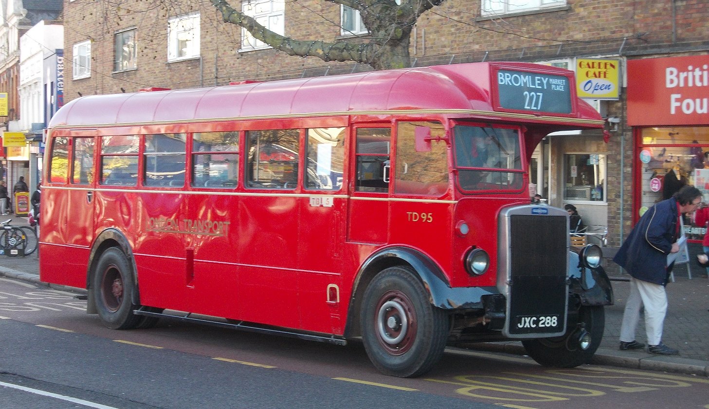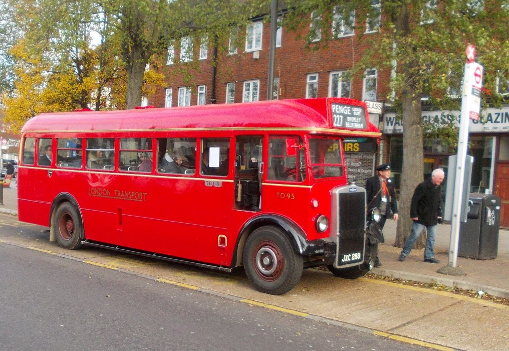 Bromley Classic Bus Mini Running DaySunday 8th December 2013Prepared on Wordpad by Ian Smith, 13th December 2013Elevenses: TD on the 227227: Bromley Market Place to Chislehurst (TD95)We waited at the Bromley Market Place stop. Another Scania arrived, 515, heading south for Orpington Station on the 358. That was followed by 10152, an EnviroTrident from Catford, that now operates on the 208, having replaced the elderly Tidents. Then a rather older single-decker nosed round the corner and pulled up to the stop. Not an LTL Scooter, that I can just remember on the 227, but TD95, from the London Bus Museum at Brooklands.The small gathering of enthusiasts climbed aboard, just about completing the complement on the bus. I took the single seat behind the driver, sharing it with conductor Peter Larkham's cache of London Bus Museum leaflets. I now had a view ahead over the driver's shoulder. We headed east. For some reason we stopped at the Town Hall stop, and I hopped off for a very quick photo. Then we headed east towards Widmore Green, down and up again through the little dip, and on along to Bickley. We turned left down Bickley Park Road, descending steeply into the Kidbrook valley and passing under the railway at Chislehurst Station. Now after several down changes of gear we began the crawl up Summer Hill. Eventually we reached the top, passed through the site of Chislehurst Water Tower, and forked half-right to follow the main road across Chislehurst Common to the War Memorial. A Trident on the 269 passed us on the common, heading for Bromley. We turned hard left at Chislehurst War Memorial. A 161 was just pulling on to the stance opposite. We dribbled down across the Common to Chislehurst Ponds and the High Street, where we made a stop. We did not want to arrive at the Gordon Arms stop too early. Then we went on, turning right down Albany Road to go round the block to the old 227 terminus. (Not the very old terminus, in front of the pub in Alexander Road, which is usually impassable by buses due to parked cars). There was still time for quick photos before the next 61 arrived. 227: Chislehurst to Penge (TD95)