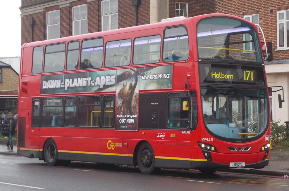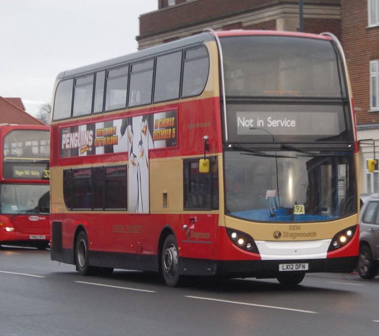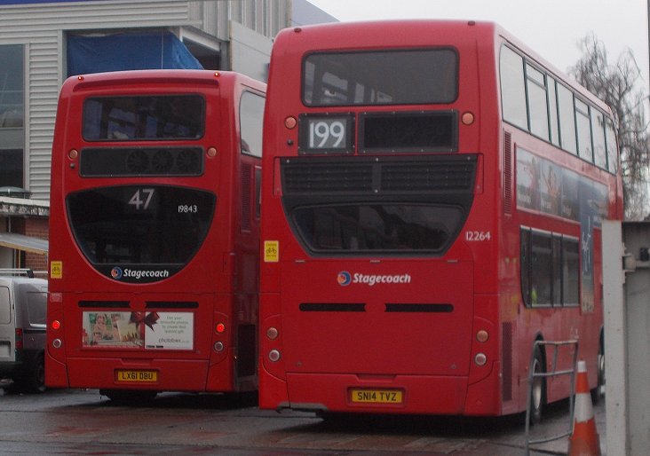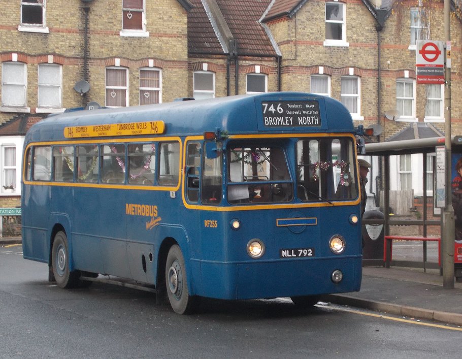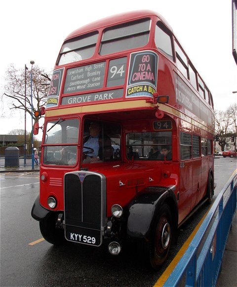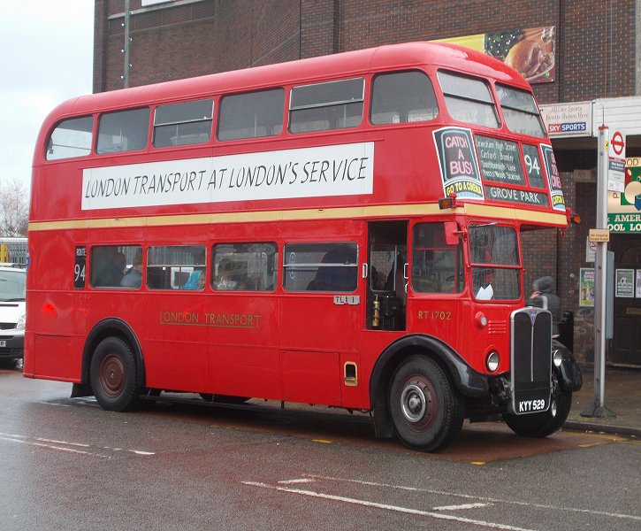 Bromley Mini Running DaySunday 7th December 2014Prepared by Ian Smith, 20th December 2013.Part One: RT on the 94Catford GarageI caught the 136 in front of the one I expected, from the old tram terminus at the top of Downham Way down to Catford Garage in Bellingham. The bus was Stagecoach EnviroTrident 10133. It dropped me off outside its home garage of Catford (TL). I was not the first to arrive for RT1702. One other prospective passenger was already outside the gates, carrying a 1/32 scale Routemaster kit in a bag. He told me that some of the crew had already gone inside to prepare the RT.I kept an eye on the bus comings and goings. At this time on a Sunday morning the garage was busy, not only with its own run-out and early returns, but as a terminus for Go-Ahead's service 171. One such was WVL386, a 2011 Volvo B9TL with Wright Eclipse Gemini 2 bodywork - the stretched 10.4m version. An interesting bus standing outside the garage between 178 turns was Optatare Temo Hybrid 25111, the first (2008) of a trial group numbering just five. The front ends of the new batches of EnviroTridents (E40H), such as 12263, are not much different from the earlier versions. It is at the rear that the larger engine compartments that the environmentally less-unfriendly engines require become more apparent, as shown by older E40D 19843 and newer E40H 12264. Another speciality emerged: 10136, repainted earlier in the year to celebrate 100 years of Catford Garage and named "Selkent Ambassador". It fired up, and pulled out to head for Grove Park to take up duties on the 136. Not all of Catford's allocation are modern double-deckers. To make the point, two of its allocation of 2002/3 vintage Dart SLFs emerged for duty, 34390 for the 380, 34353 for the P4.
