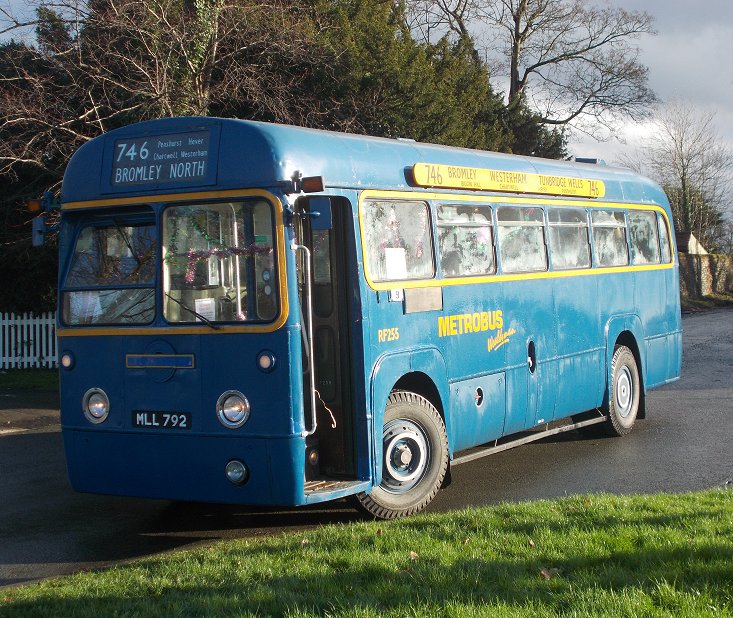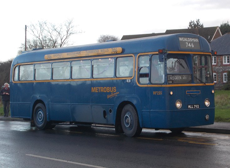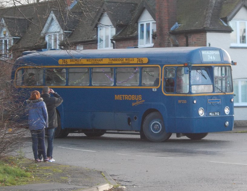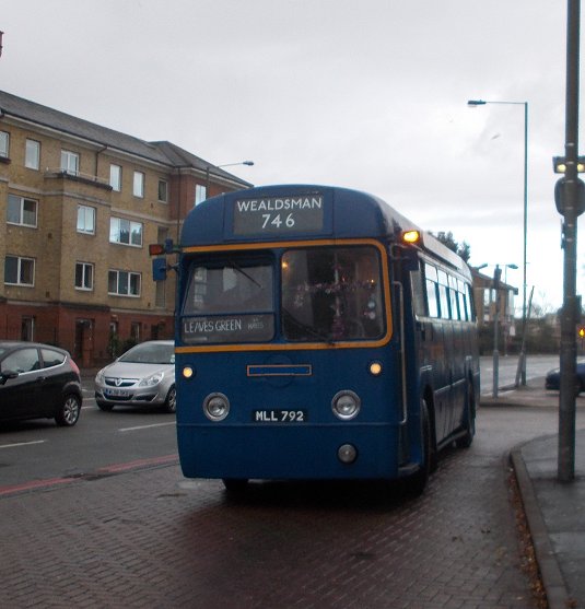 Bromley Mini Running DaySunday 7th December 2014Prepared by Ian Smith, 21st December 2013.Part Two: Wealdsman746: Bromley North to Leaves Green: RF255I did not have to wait long at Bromley North Station before a once-familiar vehicle appeared. RF255, originally a GreenLine coach, then preserved by Mike Dawes, had been overhauled by Metrobus in 1994 for use on a Sundays-only Wealdsman service between Bromley North and Tunbridge Wells, via Chartwell. For that use it received Metrobus blue livery. I had made Mike's acquaintance with RF255 at Showbus 1998, and had subsequently conducted for him on several running days and other events.But it retired from public view in 2001, although kept in roadworthy condition under cover. Mike sold it in 2014 to Tom Gurney, with whom it has re-appeared.So here it was. It turned in to Mitchell Way, and circled round to the pick-up stop outside Bromley North Station. Not being eligible to use the bus gate from Kentish Way to Bromley High Street, we headed straight down Kentish Way, then turned down Mason's Hill to pick up the 705 (and 746) GreenLine route to Hayes. Tom made a photo stop in Hayes, outside The George. By now the heavy shower had passed over, and it was much brighter. We went on, up onto Hayes Common, then past the Fox and on up past the Keston Windmill and Keston Common. We joined the old 410 route (now 320) and swooped down the curves to Keston Church, where the 146 route diverges to Downe. We forked right, and after dipping through the dry valley climbed up towards Biggin Hill. We came to a stand at Leaves Green, where the 410 route was truncated during the war. We all alighted during the turning manoeuvre, and waited at the wind-swept bus stop opposite while the bus made its turn in a side-road next to the pub. This location brought back memories of overnight wide-games organised by Bromley Scouts during the 1960s, where we had to sneak across this well-lit junction without getting caught by sentries. Oh well, back to the present. RF255 completed its turn and picked up at the north-bound stop. We headed back for Bromley. This was a favourite road for teenage me, either on bicycle or little motorbike. There was little traffic, and the trend was downhill. There were exceptions of course: the twisting climb up from Keston Church to Keston Common, and the climb up Bromley High Street. I could still do the seven miles in twenty minutes - on the bicycle, quicker on the motorbike, but not much. The RF took it in fine form. We made another photo-stop at The Fox, before rolling on down into Hayes and Bromley. The High Street was again by-passed using Kentish Way. Now it was time for lunch, before I caught a 227. Most of those were on lunch-break too, it seemed. I strolled down East Street to the Market Square, and took a window table in Cafe Rouge where I could keep an eye on the 227s... Photos by Ian Smith. Click on any of them for a larger picture.