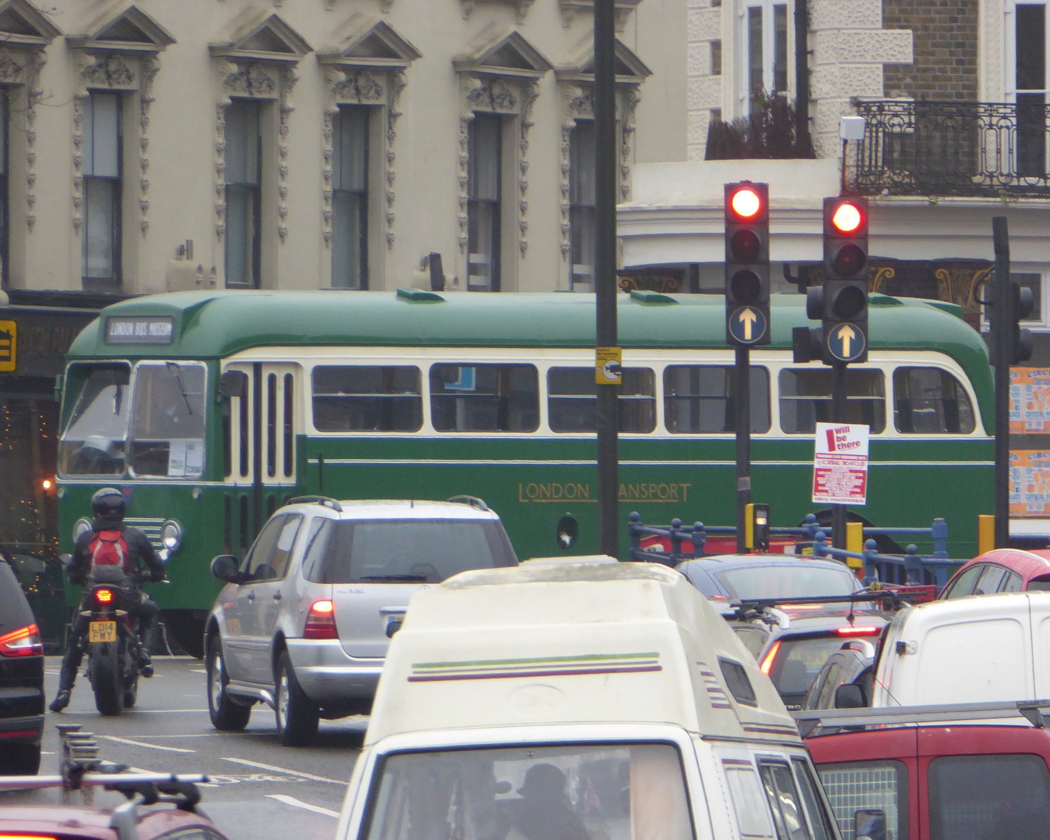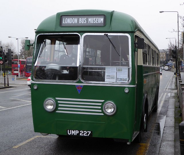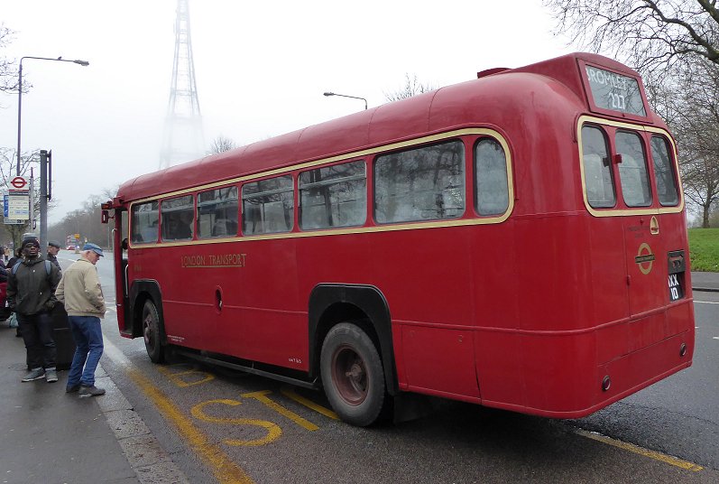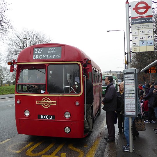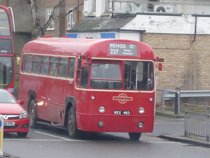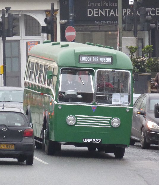Bromley Mini Running DaySunday 13th December 2015Prepared by Ian Smith, 15th January 2016.Part Three: RFs ?Crystal PalaceI stood at the boarding stop on Crystal Palace Parade and watched the buses going by. 23108 was a Stagecoach Citaro on the 227, heading back for Bromley. VLA69 was an elderly Volvo B7TL with the ALX200 body, dating from 2004. Presumably it is not long for London, or are buses lasting longer in these times of perpetual austerity/depression? Anyway, Arriva London was still using it on the 417 from Clapham Common. DWS9 was even older. This short Cadet from 2003 still works the twisting 410 from Wallington, which entails turning into estate roads and twirling right round mini-roundabouts - the kind of route that London Transport would not have contemplated, but which can use Darts to bring transport to the doorstep. Go-Ahead London's President PVL330 is even older (2002). It was heading for Elephant and Castle on the 363. Rather newer was Abellio's 2425, a three-year-old hybrid Enviro400H working on long-standing route 3, today to Piccadilly Circus. Those of us waiting at the Parade had received news that the replacement for TD95 was on its way, and had passed Sutton. It was to be UMP227, the Regal IV/Park Royal precursor to the RF, recently restored for the London Bus Museum at Brooklands. It had, in its early days, worked for London Transport in the St.Albans area and then Reigate, but not, as far as I know in the Central Area. This would be its debut, and what better route than the 227! It suddenly appeared at the south end of the Parade, at the junction where the trolleybus roundabout used to be. It went straight over, onto Anerley Hill! There were hurried mobile phone calls. It was coming back! It reappeared at the top of the hill and came along to our stop: magnificent! But it was no going into service immediately. It had only the one qualified driver. After the extensive shunt to extract it from Brooklands Museum after TD95 was found to be hors-de-combat, and the drive from Brooklands to Crystal Palace, the driver required a break. So they decided to take their lunch-break now, rather than an hour later. But they did allow me into the vehicle to see the interior - familiar, yet strange, RF-like but different. Then RF368 arrived on the other side of the Parade, offering a classic photo. It unloaded and headed for the bus station to turn. A 227 came back - it wasn'y RF368 but a service bus, Citaro 23102. RF368: Crystal Palace to Bromley North StationA minute or few later the RF returned, and pulled in past UMP227 to load up.RF368 has been restored to almost its original condition, with no doors, no conductor safety bar inside the front window, and 41 seats (with no luggage bin). It has however kept the trafficators. I climbed aboard and acquired a seat right at the nearside front, on the long transverse seat, giving me a good view out the front. We set off along the parade, following PVL332 on the 363. It turned aside to head north, while we swooped round to the east down Crystal Palace Hill. We played tag for a while with Citaro 23108 on the 227. We cruised down towards The Crooked Billet, meeting 23111 starting the long climb. Then at the south-east end of the High Street, by Kent House, we met RF486 heading into Penge pursued by DW32. We trundled on to Clock House, and on into Beckenham. We were carrying a good load of passengers, so were pausing at nearly every stop. This is not a quick route! We negotiated Beckenham High Street, and turned up towards Beckenham Church. RF429 was just peeking round the corner. After the pause at the bus-stop we headed on towards Shortlands, along Bromley Road. We crested the ridge, and rumbled down towards Shortlands. Citaro 23103 was growling uphill away from a stop on the gruelling hill up from the valley. We ducked under the bridge at Shortlands Station and climbed the sinuous Swan Hill up to Bromley. We made our way round through the Market Place - no stop there now - and headed for Bromley North, where we terminated at Mitchell Way. I gave my thanks and alighted. It was time to visit the 94....