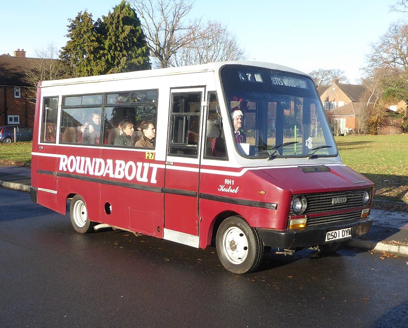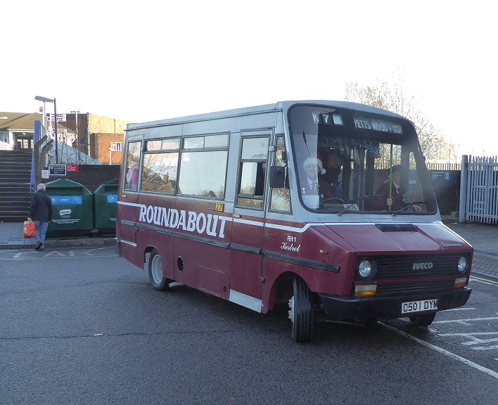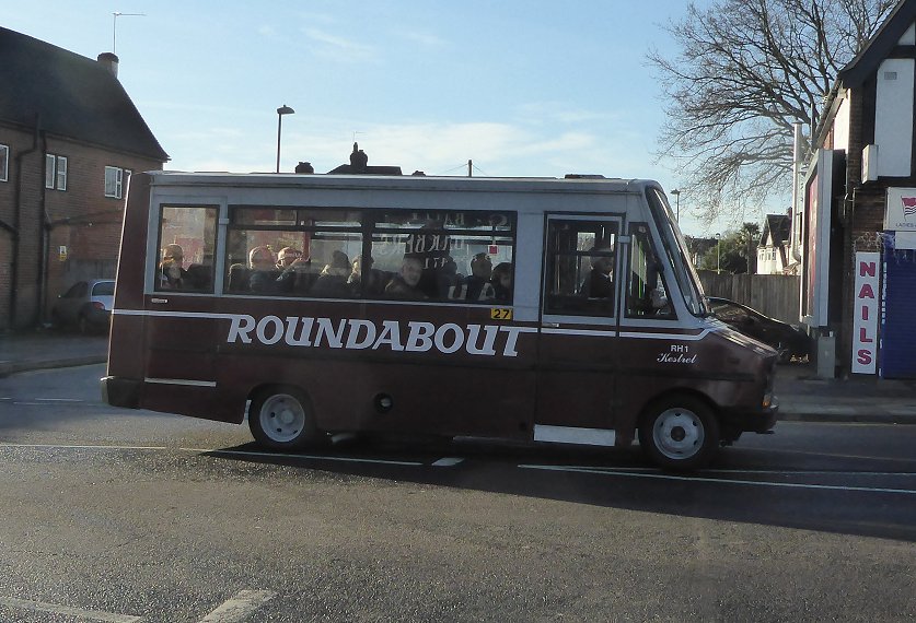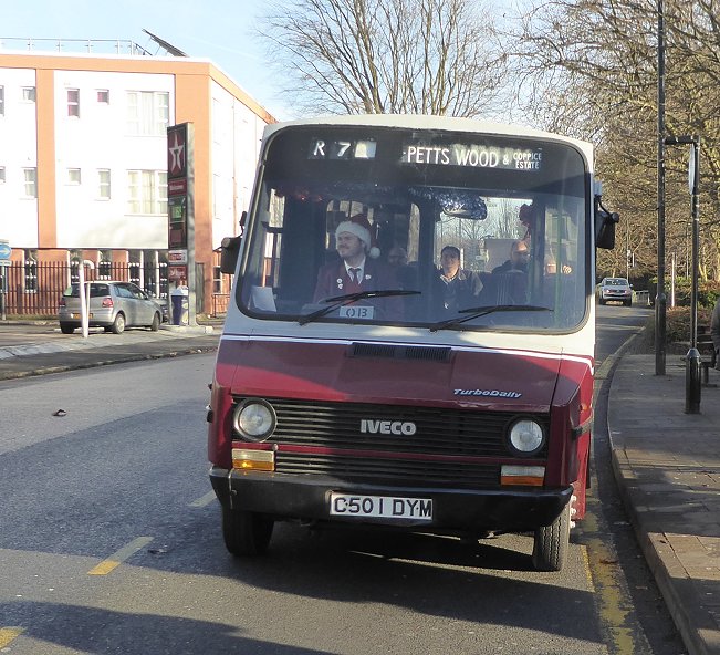 Bromley Mini Running DaySunday 11th December 2016Prepared by Ian Smith, 14th December 2016.Part Two: RH1 on R7R7: Petts Wood Station to Coppice Estate (RH1)I had a little while to wait at Petts Wood Station for the R7. I used the time to walk down to a service station to buy a sandwich and drink for later use. Back at the Station Approach I had less than a quarter-hour before RH1 appeared from the south and pulled in to the station stops. With Santa driving, it made the turn to pull up at the departure stop.This was the first time that I had seen RH1 since it was derelict in Southland's yard at the back of Swanley Garage, still in blue and yellow. It has been renovated and restored to Roundabout maroon and grey. I chatted to driver/owner Tom Gurney. It seems that although these little buses were the lineal descendants of the very popular GS class, in terms of size and purpose, this is the only one preserved. RM1397 was running a bit late on the 94. We were just about to set off when it arrived and added to our complement of passengers. We set off, turning right along the parade of shops on Queensway, and turned the corner to head west along Franks Wood Avenue. A little way along we turned off left onto Oxhawth Crescent. We were on the London Outer Orpital Path - the LOOP, where I had walked a few years back. We went straight ahead down Faringdon Avenue as the Crescent veered away, and went almost to its end before turning right to loop back up Whitebeam Avenue. I was suddenly taken back sixty years. This was where I had visited my uncle, aunt and family back then, having walked across from the 94 terminus at the Crooked Billet. RH1 turned right into Lovelace Avenue, and pulled up at a stop by a spacious green. Most of the passengers decanted to take photos. R7: Coppice Estate to Orpington High Street (RH1)We reboarded "Kestrel" and made our way back onto Oxhawth Crescent, and turned right onto Southborough Lane. As we forked left onto Franks Wood Avenue we passed EnviroTrident 10150 on a 208 to Lewisham Station.We followed the road round onto Queensway, and passed the station. Dart SLF, today's rolling stock on Roundabout services, passed on an R3 to Farnborough Hospital. We went on, turning onto Crofton Road, to soar over the railway and continue east to meet Perry Hall Road. We turned right and followed it down into Orpington, to reach the terminal point of the 208, where 10189 was standing. We turned right onto Orpington High Street and terminated at the stop there. R7: Orpington High Street to Petts Wood Station (RH1)From the stop at the very north end of the High Street we went forward, to the junction with Chislehurst Road. There we met Scania 15096 heading for woolwich on the 51, and followed it round to the stands for other Orpington services. We debouched onto Perry Hall Road, and followed it back to the end of Crofton Road. We headed back to Petts Wood Station, where the little bus pulled in to Station Approach and turned round. Now, where was RT1702?