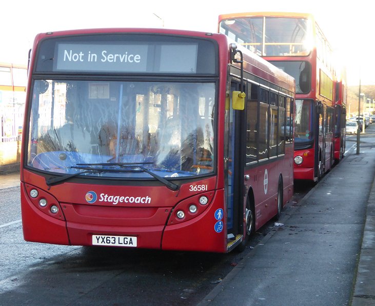we set off back up Queensway, and west to Southborough Road. There we passed EnviroTrident 10190 heading for Orpington. We continued on to The Crown, Bromley Common, where we turned left onto the garage run to Bromley Garage. Back in 94 days this was run in service, of course. RT1702 pulled up in front of the garage, where the crew were going to take their lunch break. Bromley GarageI peeped in through the corner doorway of the garage. Inside were EnviroTridents 19139 and 10191, set up for their allotted 61 and 261 routes respectively. Beyond them EnviroDarts 36554 and 36551 were off the 314, while Tridents 17795 and 18491 are still part of the 269 allocation.EnviroDart 36581 was standing outside in Quarry Road, with two Tridents off the 269 behind (including 17899). I looked in the gateway of the garage yard. Tothe left, against the wall, was a line of Tridents. Whether these are withdrawn or spares I don't know, but the blinds set up indicate recent use as spares on EnviroTrident routes: 18485 (261), 18486 (208), 17844 (664), 18489 (61) and 18489 (269). 36553 stood alongside. To the right were EnviroTridents 10145 (208?) and 19135 (61), followed by Trident 18488 off the 269, plus EnviroTrident 10151 (208). Tridents 17780 and 18494 were awaiting their next foray on the 269 (The 269 uses 14 Tridents on weekdays, ten on Sundays at present).
