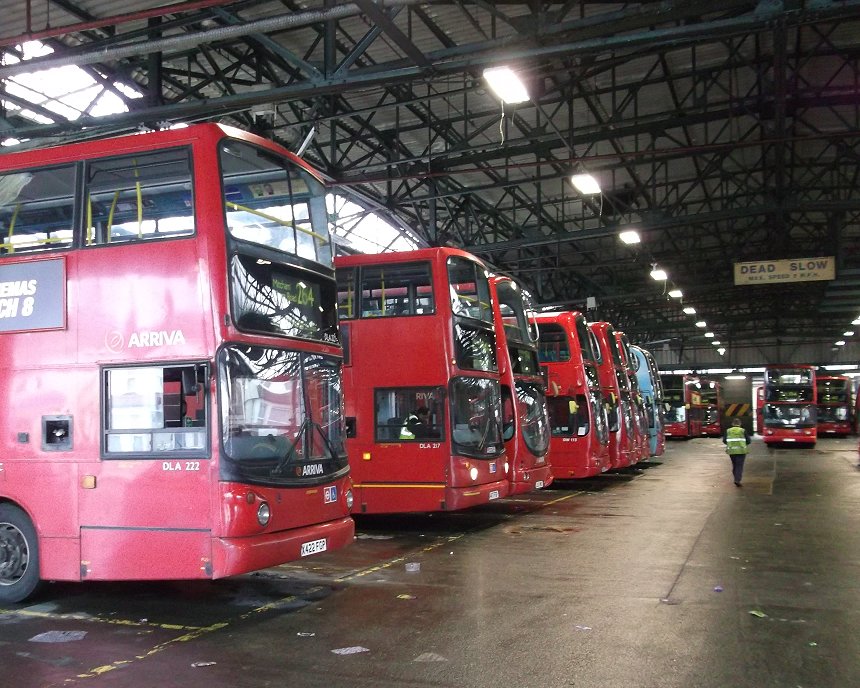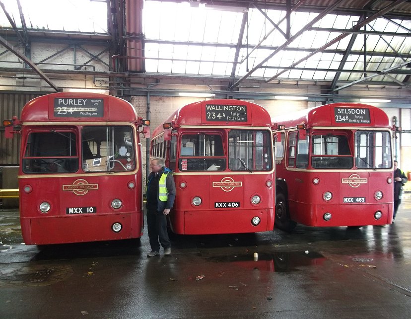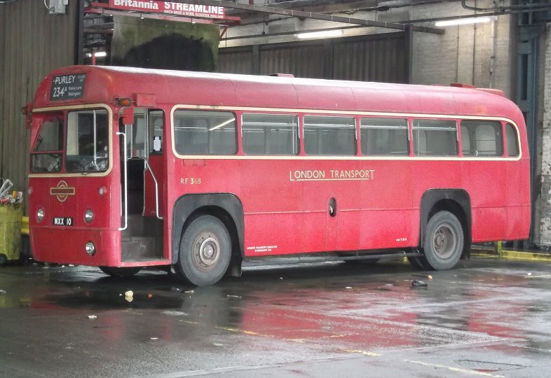 234 Routes RevisitedSunday 17th March 2013Prepared by Ian Smith, 18th March 2013.The Croydon Garage Run-outMy rendezvous with RF486 was at Purley Station at 0945. By means of an unusual railway journey due to railway engineering (Grove Park to Victoria, thence to Purley via East Grinstead) I arrive early, at about 0910. I took up my stance at Purley Station's stop Q, just east of the railway bridge on Godstone Road.After just a few minutes a red single-decker appeared: not my RF, but an EnviroDart, one of Abellio's, working the 407 towards Sutton. It paused at the stop, then whirred off. The next bus along WAS an RF. RF386 was not stopping for me though, and swept past in the grim grey light of this sad and soggy Surrey Sunday morning. I was left pondering the "advances" in single deck bus design over sixty years. A few minutes later another EnviroDart came the other way on the 407 to Caterham, followed by DW114 on the roundabout route to West Croydon via Selsdon. Both now use 4** series route numbers but both actually have been red routes for many years. Purley Station to South Croydon Garage: RF429My ride, in the shape of RF429, appeared at 0925, twenty minutes early. It was raining now, fine rain, almost snow. Perhaps it had been, on its way down. I gratefully climbed aboard the RF for the short trip to Purley Fountain, with its large roundabout, and then north along Brighton Road for two miles, to South Croydon Bus Garage.We were well early at the garage, earlier than expected, and the front entrance was well clogged up with buses. Alan Charman turned the RF up Napier Road beside the garage, to see if it was any easier at the back. It wasn't. The RF was three point turned at the road junction, and we returned to Brighton Road. Alan drove north along to the Swan and Sugarloaf, and there went round the block, and headed back to the garage. All was now clear at the front. After a chat with the supervisor we were allowed in, to park beside RF368. South Croydon is of course a busy London garage, and other buses were coming and going. Dart SLF PDL118 came in off the 312, and DW8 off the 197. RM1397 arrived, and was poitioned in the garage doorway, facing out. RF395 arrived from the north, and was reversed in beside the RM. RF486 arrived from the Purley direction, in heavy traffic, and pulled into the garage, to line up beside RF486 behind RF395 and the RM. The roll-call was complete when RT3251 arrived from Croydon, pulling through the centre front doorway and turning in the garage ready to be first out. The two double deckers were to work the 234 (Wallington - Purley - Selsdon, while the RFs worked on the 234A (Hackbridge - Wallington - Purley - Old Lodge Lane) and the Sundays only 234B (South Croydon Garage - Purley - Selsdon) There was a pause for ten minutes, while crews exchanged news and information. It was still even in the rest of the garage, where elderly DAF/Alexanders DLA222 and DLA217 flanked a line of newer DAF/Wrights.Then it was time for the run-out to begin. First out was RT3251, heading for Wallington on the 234. Then came doorless RF395, following the RT on the road to Wallington, but as a 234A, pulling out from the garage doors then coasting along to the Red Deer pickup stop. Then it was the Routemaster's turn, heading for the other 234 terminus at Selsdon. The other doorless RF, 368, was next out, heading for the Old Lodge Lane terminus of the 234A. Finally it was time for the last pair to leave together, RF486 first on the 234B to Selsdon and RF429, with me aboard, to head for Wallington on the 234A. Photos by Ian Smith. Click on any of them for a larger picture.