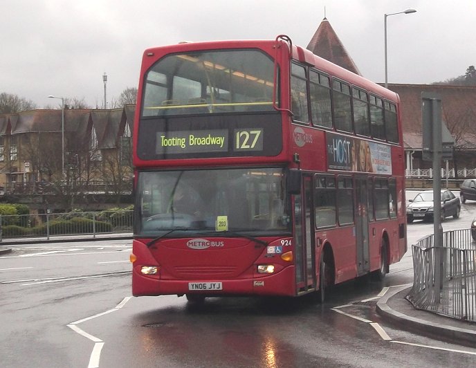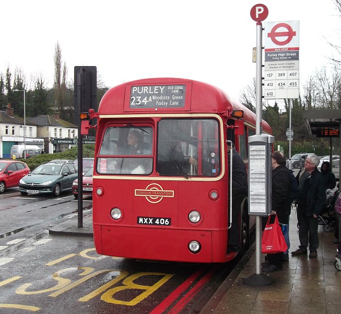 234A: Old Lodge Lane to Purley: RF429The extra turning time had eaten up our terminal allowance. With blinds reset to Wallington, Alan took the bus down to the bus stop to release the Dart. We rejoined, and we set off back down the long hill.I checked the bus times in my programme, and alighted at Purley Library, at the foot of Foxley Lane. I carefully negotiated the various crossings of the gyratory system, while buses whizzed in various directions. New Arriva EnviroDart ENX11 whirled past on a northbound 289, and Metrobus Scania 924 made more stately progress north on the 127. I headed for the eastbound 234 stop, to wait for the RT... Photos by Ian Smith. Click on any of them for a larger picture.