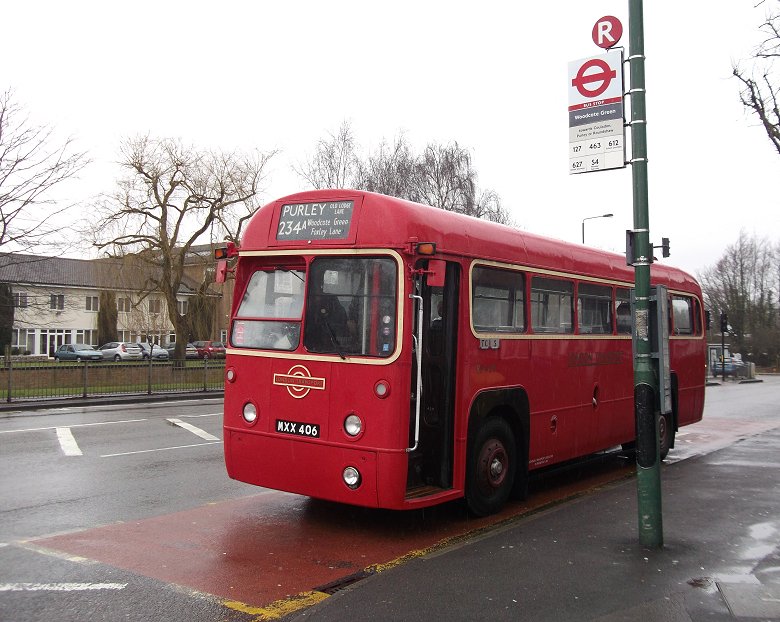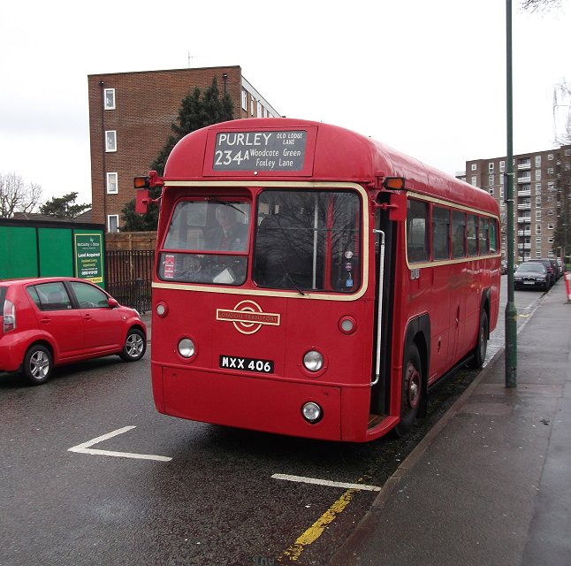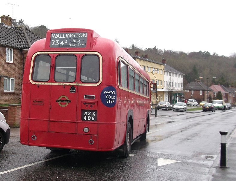 234A: Wallington to Old Lodge Lane: RF429We had a five minute layover at Wallington - time to change the blinds and stretch our legs.Further up the Shotfield stand was PDL100, working the modern-day 410. (It still seems wrong to see red single-decker 410s far from Biggin Hill!) These 9.3m Darts, one of the most successful single deckers in the London area, emphasise the enduring legacy of the 9.0m RF in being the right size bus for London. This one, delivered in 2005, still has a bit of life left in it for London service. We set off again, back the way we had come. The timetable was working well enough to allow us a short photo-stop at Woodcote Green - and allowed Alan Charman, our driver, to buy a newspaper. The puddle at the junction of Woodcote Road and Foxley Road was getting larger. We turned down the hill, and rolled down to Purley. As we circulated round the one-way system there was a glimpse through the rain-spattered windows of RT3251 heaqding back towards Wallington. We went the long way round the system, to use the layby bus-stop at Purley (Tesco), where we picked up some local passengers for the Old Lodge Lane run. We headed south on the Brighton Road, passing another RF, and by Reedham Station turned up Old Lodge Lane. We passed under the railway bridges - one at 13ft 6in headroom precluding the use of double-deckers - and forked left. We continued up Old Lodge Lane for almost a mile, carefully over the speed bumps. At Wattenden Primary School we found a bus turning circle, already part-occupied by Abellio's Dart/Caetano Nimbus 8493 on the 455. It should be possible to turn an RF on this turning circle - but not with a bus already there. Alan manoeuvred the RF round to stand alongside its modern equivalent. I spoke with the driver of the Dart, who said that he probably drove RF486 when it was at Croydon in 1965-69.
