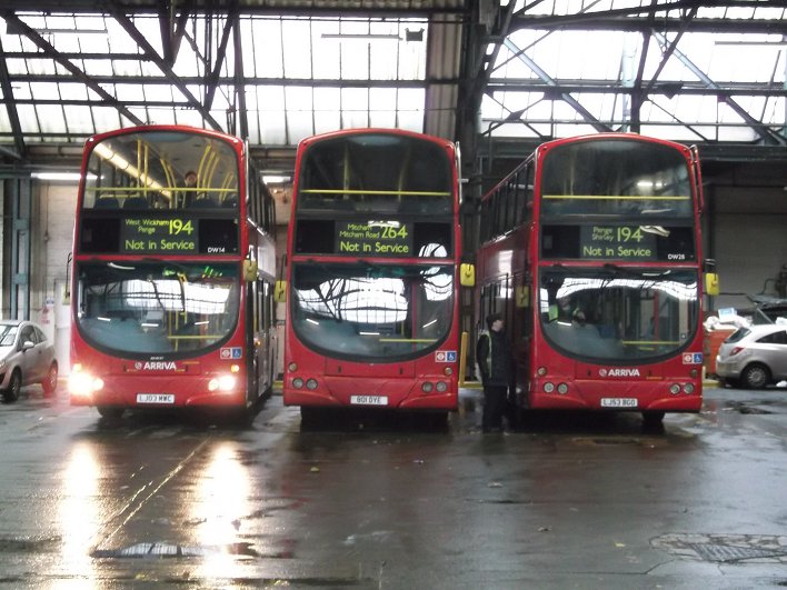 234A: Wallington to South Croydon Garage: RF429Lunch-break over, we set off again, heading this time for South Croydon Garage via Purley. We pulled out into Wallington, and headed south along Woodcote Road, soon meeting Scania 924 on the 127.We turned down Foxley Lane, and met RF368 coming up on its way to Hackbridge. We continued down the hill to Purley Cross. Due to the vagaries of the gyratory system we would not be able to turn directly north into Brighton Road. Instead we crossed Purley Way at traffic lights into Pampisford Road, then turned right down Christchurch Road to reach Brighton Road. We didn't know whether we would be able to use the garage this time, but the obliging supervisor waved us in and we parked again inside the front door, looking out. A line of DWs stood facing us, including DW1 with an ex-Routemaster registration.