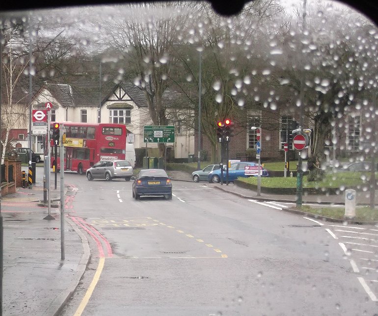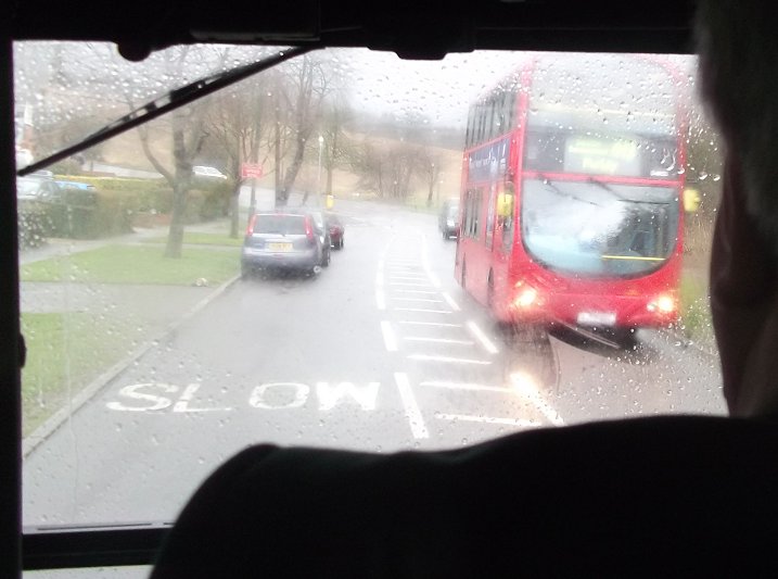 234B: South Croydon Garage to Selsdon : RF429RF429 was prepared for the trip on the Sundays-only 234B to Selsdon, involving changing the blinds, the fare chart and the running plates. During the other turns the bus had worn TC5 plates, but the 234B, a one-bus only route, only used TC1.We set off south on the 234B, down the Brighton Road to Purley, meeting other buses as we went. At Purley we turned left under the railway, and began the long climb up to Selsdon. The outside temperature dropped. Would the rain turn to snow? The windows misted up as we climbed. A DW on the 412 came down Rectory Park and passed us at the top of Mitchley Avenue. RM1397 pulled away from the Selsdon stop as we approached. We rounded the triangle (if you see what I mean) and pulled up in front of Sainsbury's as the skies opened once more.