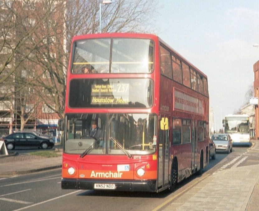 Armchair's Alexander ALX 400s: DT1-22Armchair had initially wanted Volvo B7TL / Wrightbuses for its upgrade to the 237, taking over from Olympians. But that order had been cancelled, and an order for 22 Dennis Tridents with Alexander ALX400 bodies substituted. They had a forward staircase and an exit in the fourth bay. Livery was red with a black skirt surmounted by a broad orange band. The first three arrived at the end of December 2002, and the other nineteen early in January, all ready to start the new contract in January. They operated from Brentford. As there were 22 buses for a requirement of 19 (10 on Sundays) they began sporadic appearances on other routes, such as the 190, E8 and railway replacement.