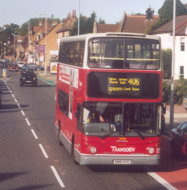 TA209, now with Transdev logos and a front dome air-scoop, at Tolworth on a 406 to Epsom from Kingston.