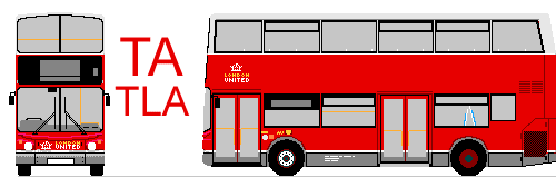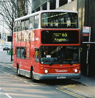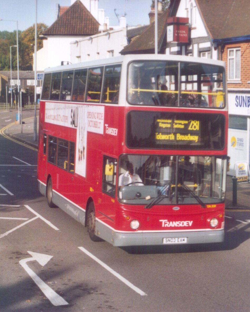 TLA4 on its customary route.Ongoing serviceThe first major change involving the TAs came in September 2005 when Scania OmniDekkas arrived at Fulwell for route 267. Thirteen of the TAs were displaced, and were distributed amongst other TA allocations. Three began a program of repaint into 90% red, in accordance with TfL guidelines. Some kept grey skirts, some grey skirts with a white line, others red skirts. Not all were repainted: some retained the traditional plae grey roof, dark grey skirt and white trim-lines for many years yet.TRANSDEV fleetnames: TA344 terminates on a 65 in Kingston, March 2009; TA328 on a 281 to Tolworth Broadway.