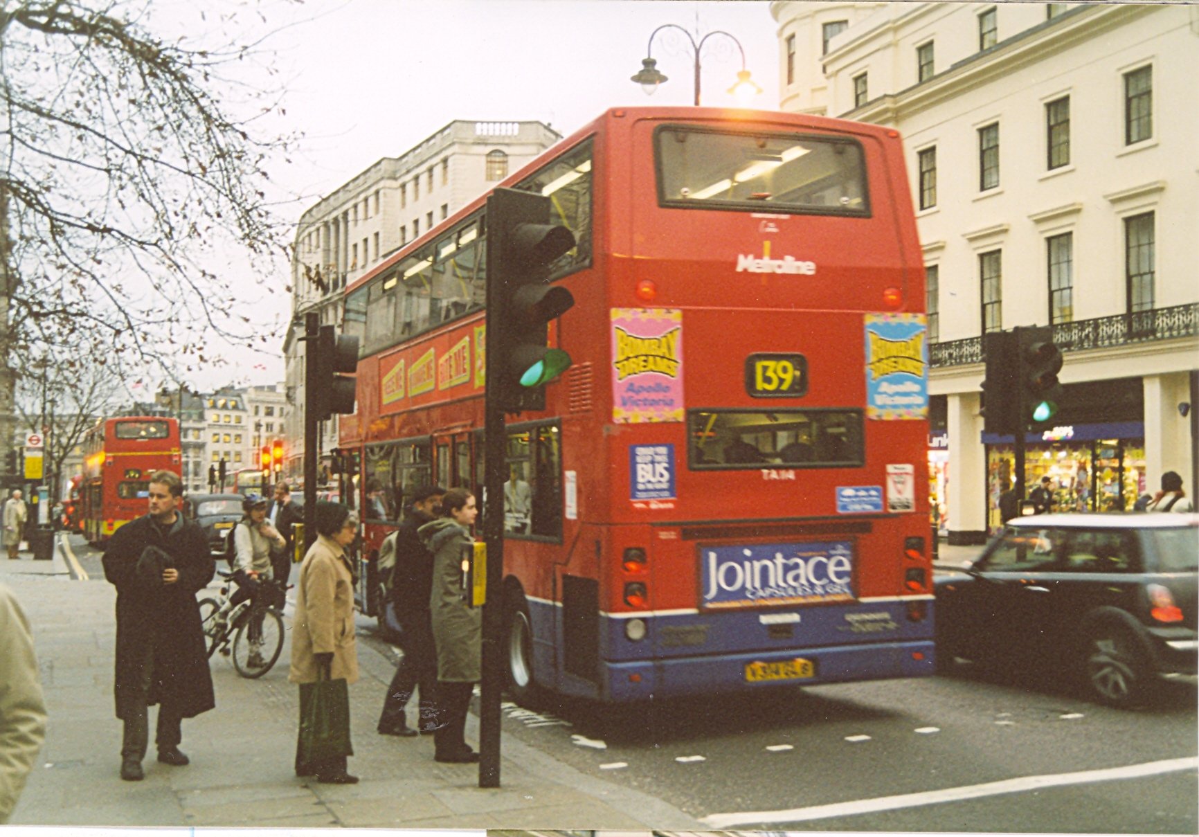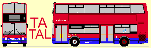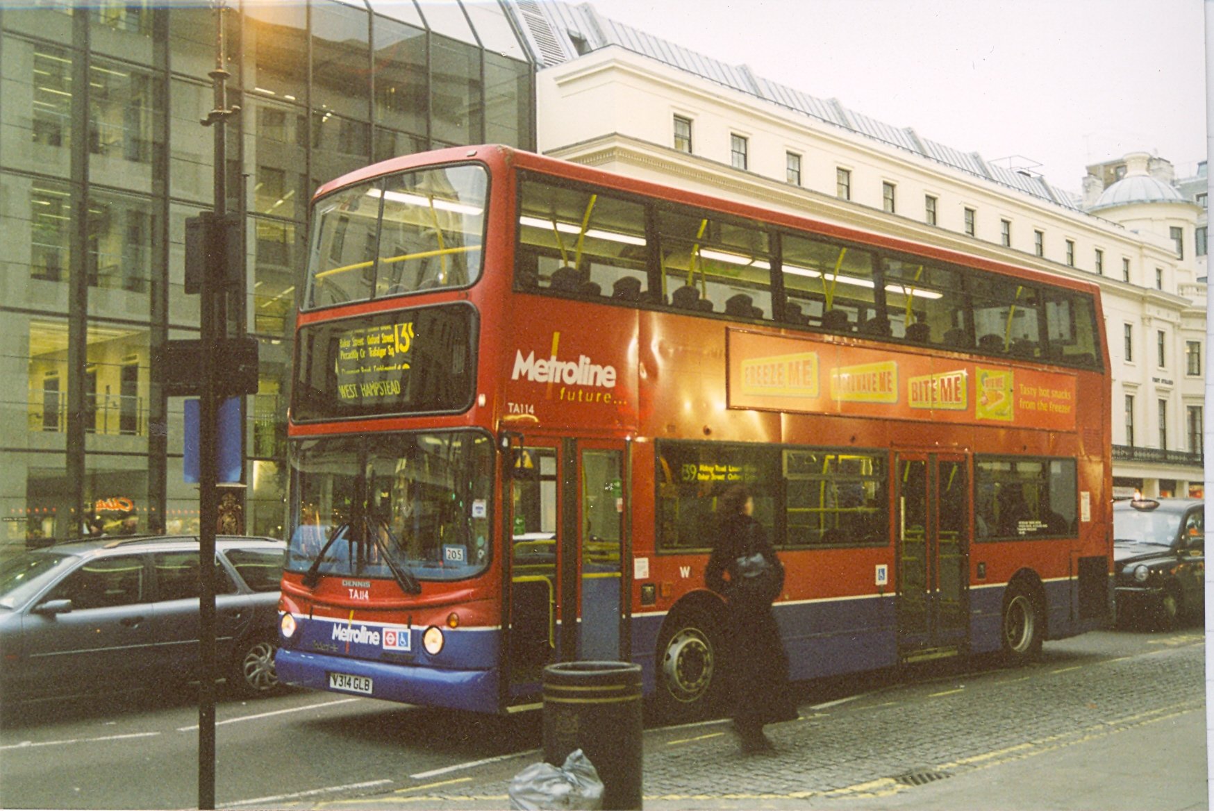 TA: Dennis Trident: TA66-117The Alexanders were numbered into Metroline's new double-deckers of whatever type. The first batch were TA66-TA81, in June 1999. Numerically they followed TP1-65, which went to Holloway. They were mid-staircase 9.9m ALX400s, painted in Metroline's house colours of red with a deep blue skirt and white cheat line. They went straight to work on the company's premier route, the 16 between Victoria Station and Cricklewood, based on Cricklewood Garage. The second batch, following on in August 1999 were for the incorporated Metroline London Northern, working from Harrow Weald on the 140 and 182. Livery was the same.They were soon to be ousted from their initial routes, by larger buses. At Cricklewood longer TALs took over the 16, and the TAs went on the 32 from October 2000. Some went to Harrow Weald to work as needed on the 186. From February 2002 at Harrow Weald it was bigger Dennis Presidents that took over the 140. TA99-117 went to Potters Bar to work the 263, while TA82-99 stayed at Harrow Weald with the 182, which became their mainstay..