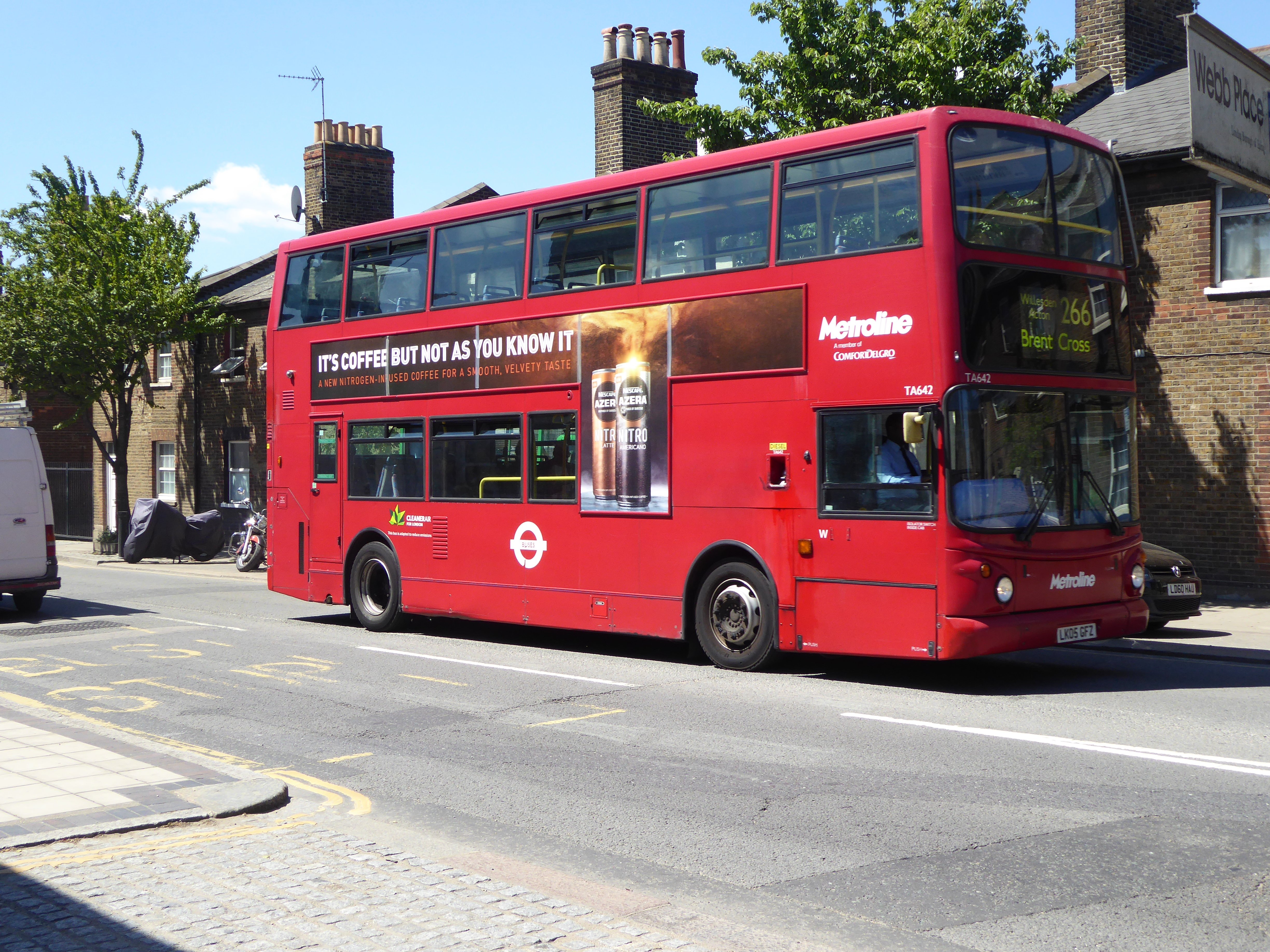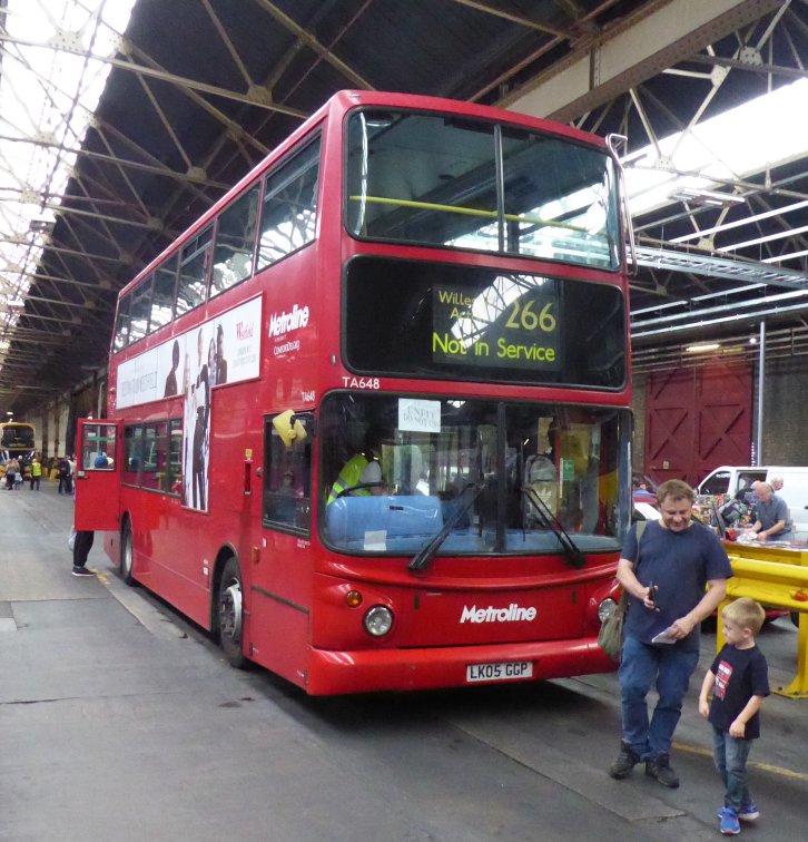 OngoingThe TAs were used wherever needed by Cricklewood, but from August 2014 were allocated to take over route 112 (Ealing Broadway - Brent Cross), which had been taken over from Abellio. Their transferred drivers were already familiar with the type. So the 112 was worked by TAs until new DE EnviroDarts arrived to revert the route to single-deck in October 2014. The TAs returned to the Cricklewood pool.Five were placed in store at Hayes in October 2016, indirectly pushed out by extra Borisbuses at Cricklewood. Four more went to Ensign Bus in November, two going straight on to Red Route Buses at Northfleet. But some remained. The return of route 266 after Tower Transit had had it from First brought another old stamping ground from the end of July 2017. This route was allocated EnviroTrident TEs, but TAs were seen again on it. The 32, 266 and 210, with their steep hills were where they were most appreciated, apparently being stronger on the hills than the more modern buses (TE, TEH). TA642 on 266 to Brent Cross, near Willesden Junction, June 2018. TA648 in Holloway garage on Open Day, September 2018.They faded away during 2019, some being scrapped by Metroline and others sold via Ensign Bus. AfterlifeSome of the TAs and TALs had substantial second careers with operators in England and Scotland: McGills in Glasgow operated several for some years. Several (TA644, 647, 652)were acquired from Ensignbus for filming a bus crash for "Eastenders". TA647 went on, unscathed, to operate schools and railway work for Cardinal Buses of Egham in a very striking red and maroon livery with a huge yellow crescent. TA651 and TA658 worked in plain red for Red Route Buses of Northfleet. Imperial Coaches of Slough had ten TALs in a striking white and black livery. Sullivan Buses at South Mimms had two TALs. Bear Buses of Feltham had a few. Ensignbus took some into operation from its sales stock, either temporarily, used in Metroline livery, or longer term. One (TA99) was converted to a hybrid - Vantage Power - back in the days when such things were rare, and gave it an eye-catching silver/blue/green Vantage Power livery. TA 648 went into preservation by the Bromley Bus Preservation group, whilst TA68, after a second long life with Axe Valley, was preserved in Exeter.