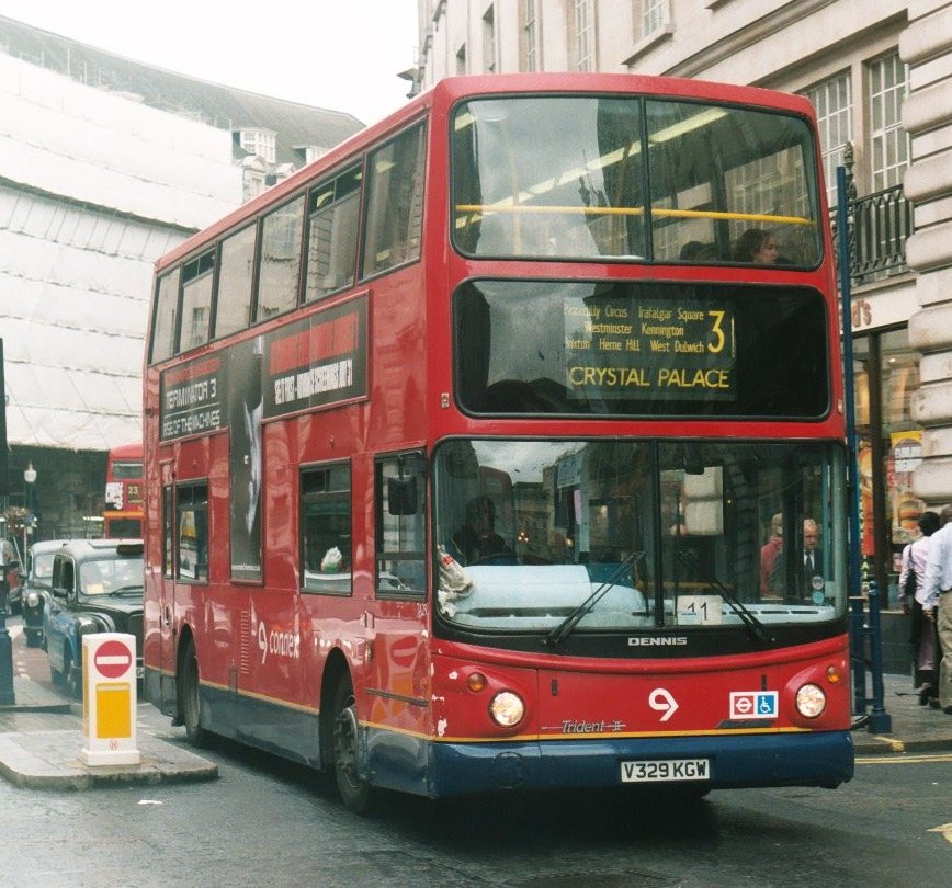 Connex' Alexander ALX 400s: TA1-TA20, TA22-TA30Connex was a train operator in South East England, but ventured into London Bus operation starting in January 2000 with a win of route of route 3, together with lengthy night route N3. For this it acquired twenty-nine 9.9m Tridents, garaged at Beddington Cross. The Tridents had central staircases, and were liveried in red with a dark blue/green skirt and an orange cheat-line. There was no TA21, probably because the licensing authority kept back the 321 registration plate.TA5 was given a gold-colored vinyl wrap in April 2002, to celebrate the Queen's Golden Jubilee