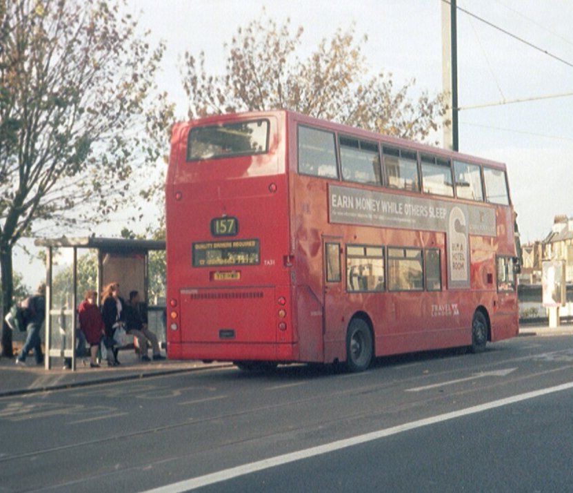 Later, now in all-red for Travel London, TA31 climbs to West Croydon on the 157 to Crystal Palace, October 2005.