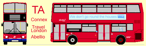 Travel London takes overHaving lost their rail franchises in Southern England, Connex threw in the towel with its bus operations too. In December 2003 many of the Connex buses lost their Connex logos (but not their legal lettering), and then in February 2004 the company, with its buses, routes, garages and staff, was taken over by National Express, to be operated under the Travel London banner.Some of the route3 buses gained overall ads for West End shows, and some of the Battersea buses gained them for Back-the-Bid. In the spring of 2005 TAs started to lose their dark blue skirts and orange lines, going all-red. The early batch (TA1-30, less the overall ad buses) were given full repaints, with white roofs.