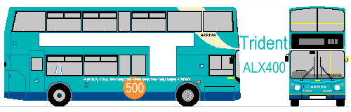 Dennis Tridents for Southend: 5434-5439, 5441-5443, 5445-5449, 5451At the same time that Luton received theirs, Arriva Southend received fifteen identical Tridents for Southend routes 7 and 8. These too were slightly low, at 4.2m, and long (10.5m), with H51/31F single doorway ALX400 bodywork. They too were downseated to H47/31F before entering service, presumably to avoid congestion around the stairwell upstairs.They stayed at Southend until 2004/5, when six of them were sent to Ware to replace ex-London Olympians on the 310/311. The changeover was in dribs and drabs, between September 2004 and May 2005. The rest, I believe, went to Arriva Kent & Sussex (if that was its name then) at Maidstone, where they spent many more years roving over Kent and East Sussex. Ex Southend 5445 on the 311 to Enfield Town, alongside the New River just south of Ware, 5th June 2005.The Hertfordshire fleetThe 310/311 at Ware settled down with the assembled Tridents, just one Olympian retained to make up the complement. Until October 2006 the 310 continued its traditional through journeys to Enfield, but from then was cut back to Waltham Cross.