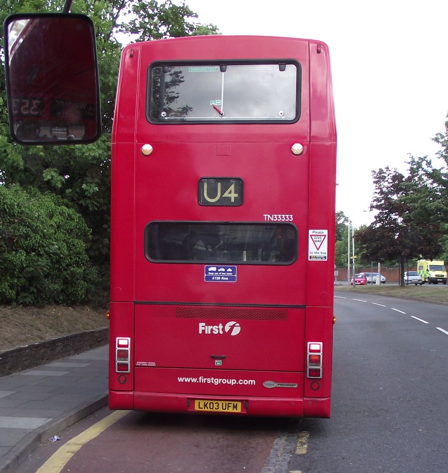 March 2012: Northumberland Park sold to Go-AheadGo-Ahead London bought Northumberland Park garage with its buses and operations on 31st March 2012. This included six Tridents: TNL 33075/076 and TN33048/049/051 and TN33231. These were gradually given Go-Ahead fleetnames and renumbered PDN1-6. Eight other Tridents were withdrawn by First into store at Dagenham.August 2012: The GamesAll fifty of the requisitioned Tridents, plus eighty-three newer EnviroTridents and six Volvo B9TLs were used for the numerous Park & Ride services for the rowing events at Eton's Dornay Lake.This Trident action was not the whole of First's contribution to Games Support. But the others were of Volvos and EnviroTridents, from the London fleet, plus new buses and loans from First Bus fleets around the country. Ordinary services had to be strengthened as well. First Berkshire borrowed TNL32929 for the Windsor area, while six withdrawn Tridents were reprieved for use on the 58 at Lea Valley Interchange. Other buses, freed up by the lack of school journeys during August, were maintained in readiness in case of disruptions. The Shuttle liveried buses did not return to service with First London. Most of the TNAs went to Glasgow during the latter part of 2012, where most gained Glasgow fleetnames. During 2014 many of these gained SimpliCITY branding, with pale blue surrounds to the digital displays and a matching blue banner across the top of the front windows.