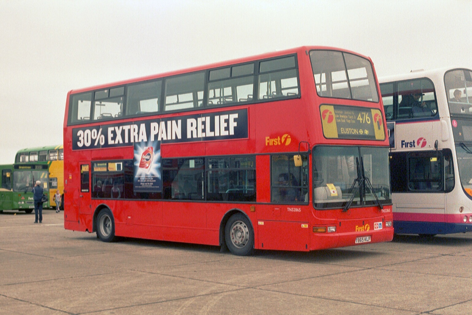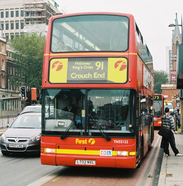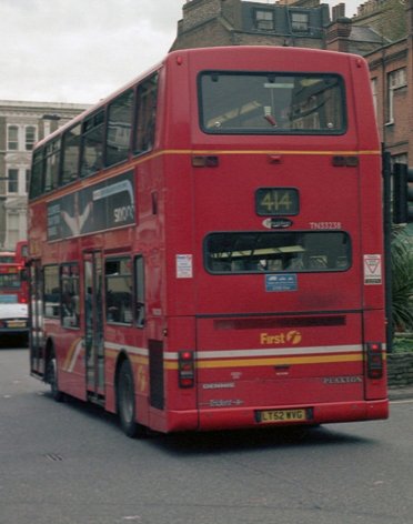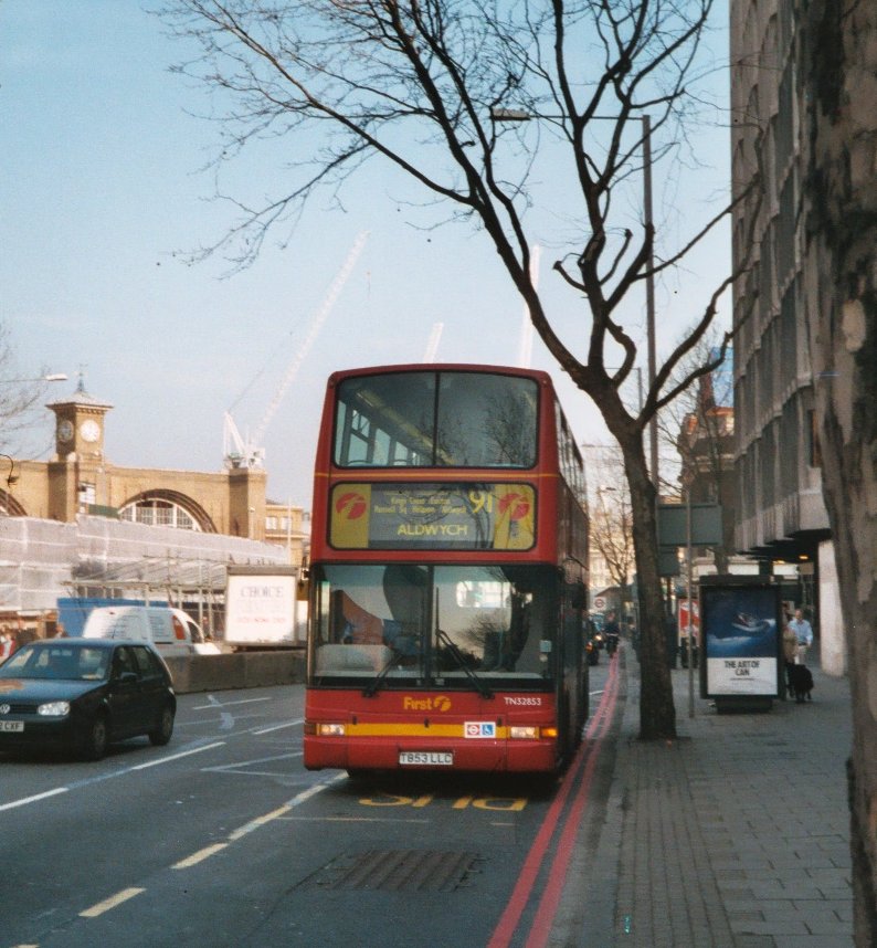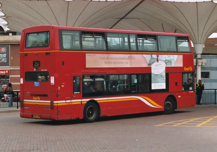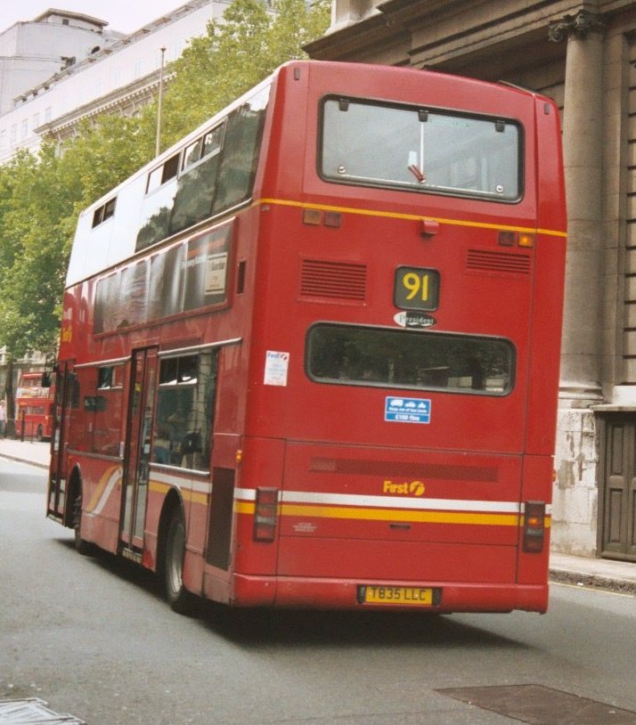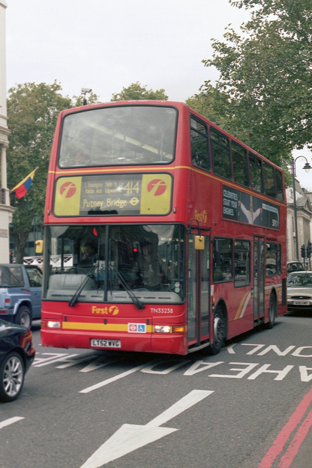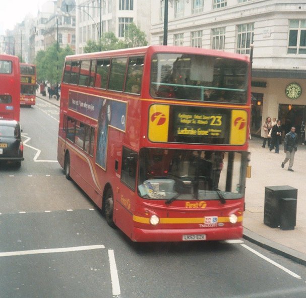 TN 810 T810 LLC LBM113 p57 */00 DM on First 25 to Ilford, Stratford Station TN 829 T829 LLC LBM110 p4 */99 X on Centrewest 18 to Euston Station, Wembley TNL921 W921 VLN LBM115 p9 */01 on First Uxbridge Buses 7 to Russell Square TNA32940 W840 VLO LBM515 p0 6/07 on hire to Metroline for 297 to Ealing Broadway TNA32948 W948 ULL LB2007 p26 6/07 on hire to Metroline: used on 460 to Willesden TN32960 X612 HLT TLB521 p0 12/07 AV on hire to London United: on 120 to Hounslow, AV TN 963 X963 HLT LBM116 p9 */01 X on First Gold Arrow 27 to Turnham Green TN32963 X963 HLT TLB517 p50 8/07 S on hire to London United: on 94 to Acton Green, Marble Arch TN32964 X964 HLT LB2007 p43 12/07 TW on hire to London United: on 57 to Streatham Hill TN32965 X965 HLT LB2007 p43 8/07 S on hire to London United: on 49 to Shepherd's Bush Green TN 975 X975 HLT LBM117 p5 */01 ON on First Challenger 258 to Watford Junction Station, Harrow TN 986 X986 NLP LBM117 p5 */01 G on First London 105 to Greenford Station, Greenford Bdy TNL1016 LK51 UYT LBM118 p7 10/01 on First London 259 to Kings Cross, Edmonton Green TNL33032 LK51 UYZ LBM572 p49 3/12 at Ecobuild event at Excel, single doorway, new Shuttle livery TN33054 LN51 GKL TLB555 p0 9/10 NP on 341 to Waterloo TNL1003 LK51 UZS TLB479 p0 */04 R on 25 to Ilford TNL1073 LN51 GDE TLB450 p00 1/02 DM on 123 to Ilford, Wood Green TN 1113 LT02 NVX TLB454 p21 4/02 NP on 91, gold-wrapped for Queen's Jubilee TN33247 LT52 WUY TLB529 p45 8/08 DM on D6 to Hackney Central, Bethnal Green TN33330 LK03 UFG TLB555 p0 9/10 UX on U3 to Heathrow Central, Uxbridge