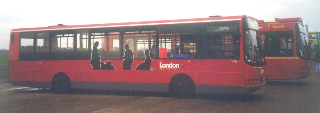 VWL 1 at Showbus VWL 1 was the Volvo low-floor offering, taken on by London Transport in August 1995 at London General. It was in London red with low-floor /accessibility logos in the form of people-sized silhouettes along the sides of the bus. I have found little written about its performance with London General. It was used on the 201, and later on the free Tesco supermarket service at Epsom. By the time I saw it at Showbus 1998 it was looking a little sad, with its offside silhouette population cut off at the knees.