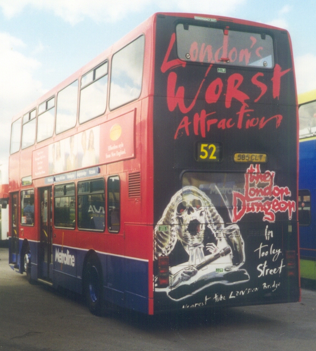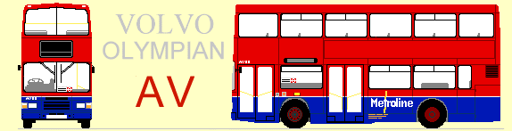 AV1-22Metroline bought twenty-two dual-doorway Volvo Olympians with Alexander RH bodywork in the autumn of 1996. They had forward staircases. They were finished in Metroline's simple but striking red with deep blue skirt. Many received full rear adverts.They went to Willesden for route 52 (Victoria - Kensal Rise - Willesden Garage), replacing the Titans that had been introduced to the route by London Coaches. They also operated the N52, plus special Christmas services each year. AV1 wearing an ex-Routemaster registration, plus an awesome (or awful) rear advertisement, was on display at Cobham Museum's Open Day in April 1999.The 52/N52 was their staple fare until they were in turn displaced by low-floor Volvo B7TLs in March 2001. The AVs took over route 266(Hammersmith - Brent Cross), which was also moved to Harlesden Garage (HR). Harlesden garage was renamed Park Royal (PR) in January 2003.AV9 and AV14 were on the 266 at Hammersmith in October 2001.
