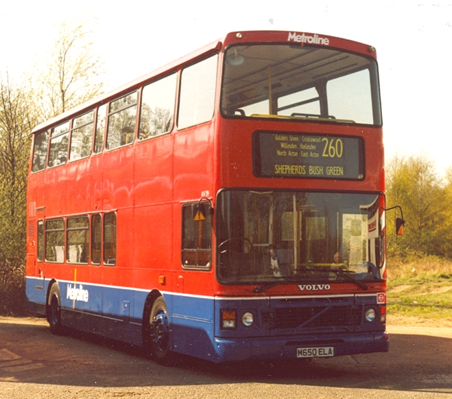 AV39In April 2000 Metroline was bought by Singapore-based Delgro. Their Singapore Bus Services sent Metroline one of their 1994 10.5 metre Volvo Olympians with Alexander Royale bodywork, painted in Metroline livery. Metroline replaced the tropical windows and the doors with British standard products, reregistered it, numbered it AV39, and put it to work from Willesden as a spare on the 260 and 52.It too moved to Harlesden in October 2002. When Park Royal closed in May 2005 it moved to Harrow Weald. It too was an extra on the 205 in July 2005, but by now was recognised as superfluous. It was the first to go to Ensign Bus in September 2005. AV39 at Cobham Museum Open Day, April 2002