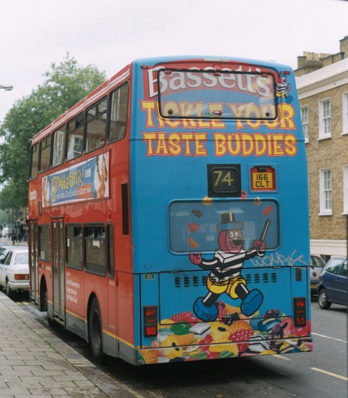 London Central NV33 and NV31 were on New Cross routes 172 and 171 in Brockley on a dismal day in October 2000.The Metrobus years: Metrobus 881 (NV41), 870 (NV30) and 875 (NV35) on the 261, between Bromley North and Grove Park in September 2001.NV49-79, 81-99August 1997 saw the start of a delivery of two dozen dual-doorway Olympians to Camberwell to replace Titans on routes 35 (Shoreditch - Clapham Junction) and 40 (Dulwich Library to Aldgate Station). This was completed by a further ten in July 1998. In between came sixteen for New Cross, where they took over from Titans on route 21(Lewisham - London Bridge Stn), starting in February 1998. One of the New Cross buses (NV58) was covered in gold-coloured vinyl in 2002 as part of the Queen's Golden Jubilee celebrations.In summer 2002 routes 35 and 40 went low-floor with PVLs, making a number of Camberwell's NVs redundant. Sister company Go-Ahead North-East needed buses, and about thirty-three of this batch of NVs headed north-eastwards to meet their need. The others hung on, filling niches, mainly until the autumn of 2004, when more were sold via Ensign Bus. Ensignbus took NV60 and converted it to single-doorway and painted it green and cream, mainly to show customers what they could supply, but using it in service as appropriate. They certainly managed to sell the others! Mullany's of Watford and Sullivan Buses of South Mimms took some for rail work and contracts. Just one, NV72, hung on with London Central as a dedicated trainer. London GeneralNV101-139, 141-159London General had been privatised with a substantial Metrobus fleet, and in early 1997, when they had joined London Central in the G0-Ahead group, they started buying Volvo Olympians. These were all dual doorway buses, very similar to those that London Central were oredering. Those for Sutton had Palatine I bodywork, and arrived in batches throughout 1997 and early 1998. Livery included a yellow coachline above the pale grey skirt.Sutton put them to work on the 93 North Cheam - Putney Bridge, 154 West Croydon - Morden Stn, and 157 Crystal Palace - Morden Stn, all retained TfL contracts, and then on the 213 Sutton Garage - Kingston. London General NV104 and NV158 were on the 93 at Putney in June 2000.Their sojourn at Sutton was also prematurely cut short, when low-floor buses (EVLs - East Lancs bodied Volvo B7TLs) took over the 93, 154 and 213 in 2002. (The 157 went to Travel London). The four-year-old NVs were distributed around the other garages, including the London Central ones. Stockwell used some to replace their older Volvo VC Citybuses. Some displaced Palatine IIs from Putney so that the posher buses could form a commercial services fleet.TrainersThen in spring 2003 many were placed in a dedicated training fleet. To emphasise that these were not service buses they were given a distinctive blue-based livery - although this does not stop the public from trying to hail them or board them, apparently! The blue base was then superscribed with banners in red, yellow, purple or mint, or with multicoloured rainbows, plus the trainers' phone number in large white letters. The trainers became a common sight, being allocated to most of the group's garages.Trainers: NV132 pulls out of New Cross garage and NV128 near Lewisham, January 2005.NV161-187The twenty-seven Olympians chosen to replace Metrobuses on Putney's route 74 (Roehampton - Baker Street) were different in having the Palatine II bodywork. Livery was red with light grey skirt, yellow cheat line and a double white line at roof level. There was some discrete route branding, iterating major attractions on the route. As they penetrated the West End they were effective advertising hoardings, and the rear ends were soon adorned with super-rear adverts.They arrived at the end of 1997, and went into service in January 1998. NV166 at the Baker Street terminus of route 74 in October 2001, showing how the rear ends were used for adverts.