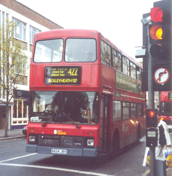 NV11-27The next batch were also single doorway buses, seventeen ordered for route 51 for the contract renewal in November 1995. These wore the standard livery of the time: red, light grey skirt and a narrow white band at lower ceiling level. They went to Bexleyheath.They had not been in service long when NV16 went for its FFD - and it was discovered that it wasn't NV16 at all: the VIN plates did not match the registration. Others of the class were found to have the same problem, due to a mix-up at Northern Counties. So several had to be reregistered with the correct plates, and the fleet numbers were amended to match. Single-door London Central NV24 was on 422 to its home town of Bexleyheath, in Woolwich on 28th October 2000.They didn't stick as rigidly to their prescribed route as buses allocated to other garages did, and soon they could be seen on a variety of Bexleyheath's double-decker routes. NV11 was unique amonst this batch in being transferred to Metrobus at Orpington in July 2002 (as 896).But the low-floor revolution soon caught up with the rest, and most of the batch were sold via Ensign Bus during 2004, the rest following in 2005. Buyers included Solent Blue Line, Aintree Coaches, First Manchester, Blackburn Transport, Yorkshire Traction, and Hedingham Omnibuses. Ensignbus repainted NV13 in apple-green and cream and used it on the X80 as well as for demonstrations, before selling it on. Sullivan Buses bought NV26. They were still young, but no longer fitted TfL's stringent contract requirements for buses without steps. NV28-48