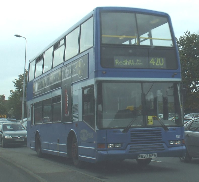 Metrobus tried to keep its batches of buses tied to particular routes. (Presumably that made accurate route-based accounting easier, and retendering more evidence-based). So these eleven buses became regulars on the 261. Metrobus 822 on the route it was bought for: route 261, at Bromley North Station in March 2000.817-819, 821-823 moved to Crawley in May 2001, to replace hired Metrobuses after the company takeover of Crawley operations from Arriva. The other five moved to Godstone for the 409 (West Croydon - East Grinstead). Their place on the 261 was filled by two-door NVs transferred in from London Central. In the spring of 2005 the Godstone buses moved to Crawley to join the others, and they started to receive the new livery of pale blue and blue.Olympians in Country blue/blue at Crawley in September 2009, now with digital displays.