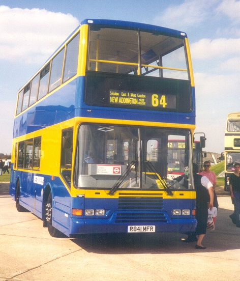 830-839, 841-845: 2-door PyoneerFor September 1997 Metrobus won the contract for a route right in the heart of its own original commercial operations, the 64 (Thornton Heath - Croydon - Selsdon - New Addington). It required two-door new buses for the contract, and acquired fifteen Volvo Olympians with East Lancs Pyoneer bodies. These became 830-839, 841-845. They were of a very different style, with seemingly-huge windows and a futuristic shaping (compared with the standard boxes otherwise available). When new they had three-track number displays on their fronts, but these were replaced after a while with LT-style single number blinds.841 at Showbus, Duxford, when new in September 1997, and 836 on the 64 at New Addington, July 2000.