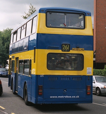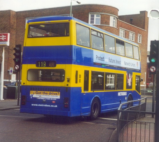846-858: 2-door PyoneerMetrobus approached the re-equipment of the 119 for the August 1998 takeover from Stagecoach rather differently. They could see that any new buses for the route would likely have a short working life on their London tendered operations, as low-floor double-decker operation loomed. Nor would they be able to absorb yet another batch into forseeable "Country" operations. So they leased the thirteen buses needed for the 119, choosing again two-door East Lancs Pyoneers. This batch stayed with the 119 until the Omnidekkas arrived. They did have forays onto other routes, and some were borrowed briefly by Crawley, but their specialised blind layout did not encourage off-route ventures. All except three (851, 855-6) returned to East Lancs early in 2004, and the other three in February 2005, for dispersal to other operators.Metrobus 855 and 856 at Bromley North Station in March 2000 on the 119 to Croydon Airport.859-866: 1-door Palatine IFor the 320 (Bromley North - Biggin Hill Valley), also taken over from Stagecoach in autumn 1998, Metrobus opted for single-door Palatine Is, which presumably would have better prospects for secondhand sale at the end of the tender period, being an industry standard. Arriving shortly before the contemporary batch of Pyoneers they started work on the 119, but turned to their allotted route as the East Lancs batch arrived. They would not have to cope with Westerham Hill, because those journeys had been taken over by Darts on the new 246 route. So the eight Volvos spent their time rolling up the north side of the North Downs from Bromley, then dropping into Biggin Hill Valley, then toiling back out for the roll back to Bromley.The first three went to Godstone in early 2001, probably for use on the 409, 410, 411 group. The others were gradually displaced from the 320 by incoming low-floor Omnidekkas. Then all eight were sold in December 2003 to Rossendale Transport. Metrobus 861 turns from Tweedy Road at Bromley Market in March 2000, terminating on the 354.868-882 (with gaps): 2-door London Central NVs