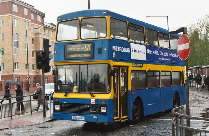 But the 261 received its intended new low-floor Tridents in January 2002. Five of the NVs promptly returned to London Central at Camberwell. Others filled in the gaps left on the 64 when some Pyoneers left Orpington for Crawley. These seven stayed until May 2003, when new Omnidekkas banished them from the 64, and indeed from the fleet. They went away for storage at First's depot in Leicester until buyers could be found for them. Metrobus 870 (alias NV30) at Grove Park Station in September 2001, and departing the New Street Hill stop.885-896 (with gaps): 1-door London Central NVsThree single-doorway NVs came to Metrobus in May 2001 from Peckham. They were repainted by Caetano into blue/yellow, and went into service as 888-890 at Crawley, where they stayed until mid-2006.Seven more came from Bexleyheath in June/July 2002, when they took up residence at Orpington mainly for use on the 320, displacing other buses towards Crawley. These were relatively short-lived at Metrobus, being sold off in May 2003 as new low-floor buses arrived. Metrobus 885 (ex NV5) leaves Bromley North Station for Biggin Hill Valley in April 2003, just before withdrawal. Bus Stop