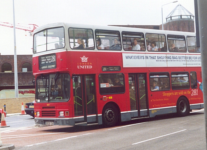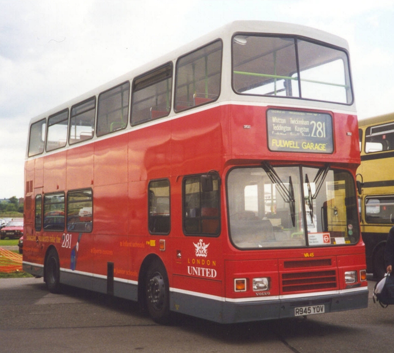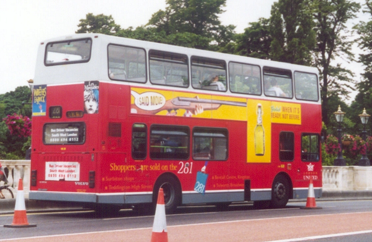 VA 32-54London United also bought a batch of twenty-five dual doorway buses in the spring of 1998, to a very similar specification to the Westlink buses. These were for the 281 (Hounslow Bus Stn - Kingston - Surbiton - Tolworth), and were adorned with not graffiti but route branding, extolling the virtues of the route for shoppers or commuters. They went to Fulwell garage for the task. Brand new VA45 was displayed at North Weald Rally in June 1998.VA38 presents different aspects to view on Kingston Bridge, whilst on its branded 281 route in June 2001Most of the batch were placed in store for disposal during April 2003, having been replaced on the 281 by new low-floor Tridents.VA 45-49 were used on Twickenham rugby specials in April 2003, then moved from Fulwell to Tolworth in May 2003 for use on the 406 (although appearances were made on the 57 when new buses misbehaved.) They were joined in June by VA50-51, the seven buses maintaining the 406 and 467. Some of Fulwell's youngest VAs went back into service to cope with deficiencies with the new buses there. VA52-54 were repainted during the summer of 2003 and returned to service in September as school buses, with Transdev fleetnames. VA32-40 were sold to First Bus in June 2003 and went north to Leeds. VA41-44 had an interesting couple of years, mainly at Fulwell or Hounslow Heath, before being sold in November 2005 to UK North.
