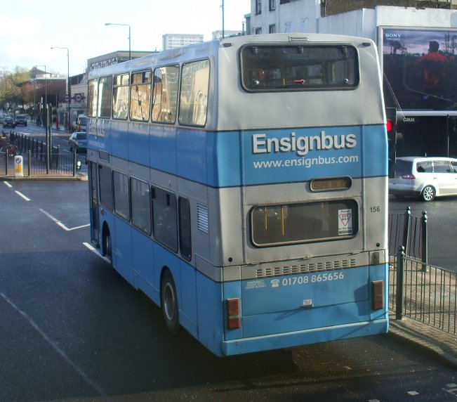 124, 125, 132, 136, 138, 152, 156, 159: Alexander RHs, ex MetrolineMetroline retired ten-year old Alexander RH-bodied Olympians in 2008, and sold them through Ensign Bus & Coach. Eight were taken on for Ensignbus' increasing workload on railway replacement work. The centre exit doors were removed, and they were treated to the blue and silver livery.156 on Railway Work, East End