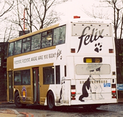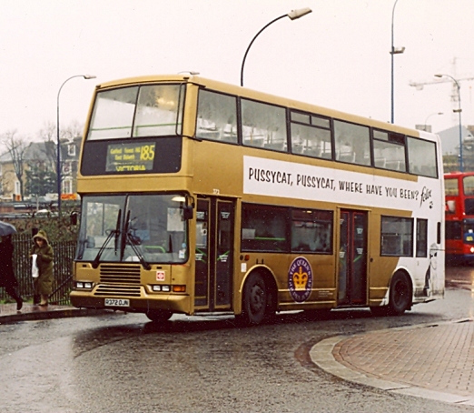 In summer 2002 East Thames Buses took delivery of Wright-bodied Volvo B7TLs, intended to replace the remaining DAFs and most of the Olympians. They started on route 180 in August. Some Olympians moved to Ash Grove, swapping with DAFs that were to be used on peak-hour extras on the 53. Some Olympians appeared on these too. The gold Olympian oscillated between duties north and south of the river for the rest of the year. The 53 extras ceased in October, but work became available on the 185 (Victoria -Lewisham). The single doorway batch was withdrawn fro Ash Grove in November 2002,