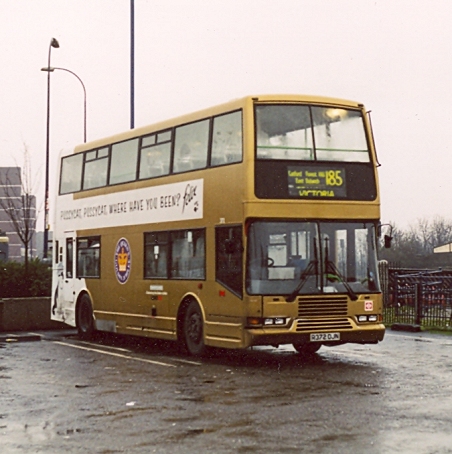 372 in gold at Lewisham Bus Station in December 2002, working a properly-blinded service on the 185.Early in 2003 the gold vinyl on 372 was removed, and Olympians returned to peak-hour workings on the 53 in mid-February. Some of the class received new ELV class codes, and new numbers, during the second quarter of 2003. The early batch, 338-350, were gathered together at Ash Grove and then returned off-lease in July 2003.The later batch, now ELV13-25, followed off-lease in mid 2004. The off-lease buses mostly found new operators. Most went to UK North in Manchester, while other operators were Reliance of Sutton-in-the-Forest (north of York), Anglian of Beccles, (Norfolk), Whippet of Fenstanton (near Cambridge), Marshall's Coaches of Sutton-on-Trent and South Lancs Travel. The only one to stay near London was 339, which went first to Southdown PSV and then Centra, who used it variously at Stansted, Gatwick and on the ex-Mitcham Belle routes. Centra restored it to red, with a blue skirt and reflective silver cheat-line. 339 moved on, with most of the business, to Flights Hallmark in August 2005.