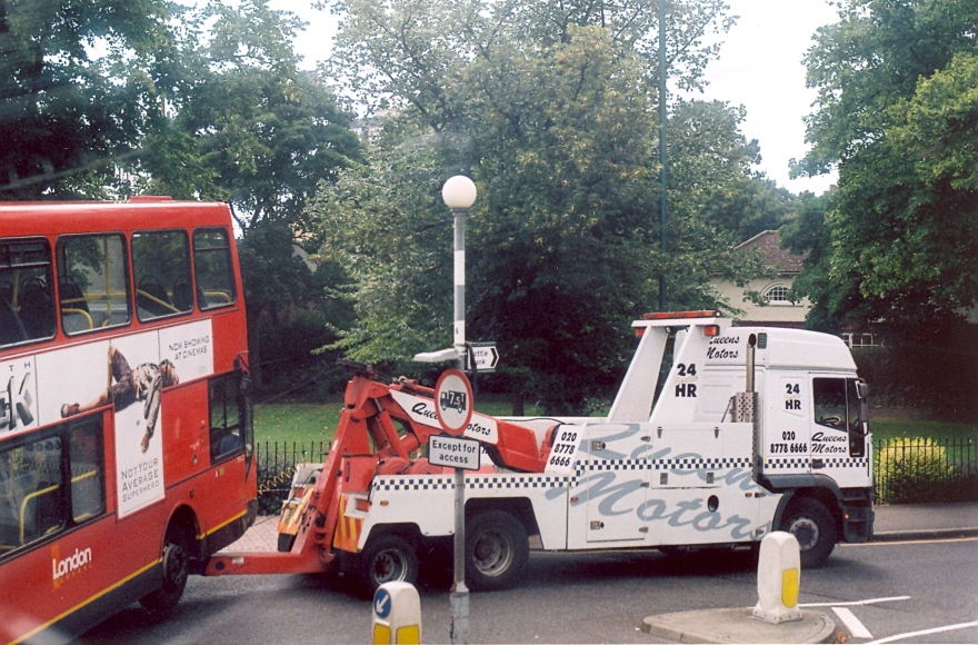 Approaching Sutton Garage we came up behind a slow-moving EVL2. It seemed a bit odd. The "On Tow" sign on the back gave a hint why: the front was tilted up while it was on tow from Queens Motors' huge tow-truck. This became obvious when the equipage turned right to reach Sutton Garage.