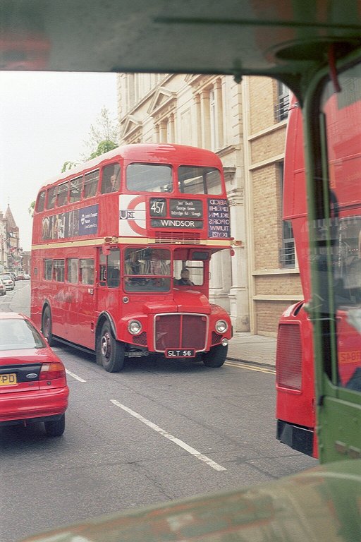 On our way out of town we met RT2177 wearing route 81 blinds as it headed for Windsor, a reminder of the days when Central Buses did reach Windsor via Slough. Out on the by-pass we passed another red RT, this time last-in-service RT624 on a Country Area route 457 service to windsor from Uxbridge.